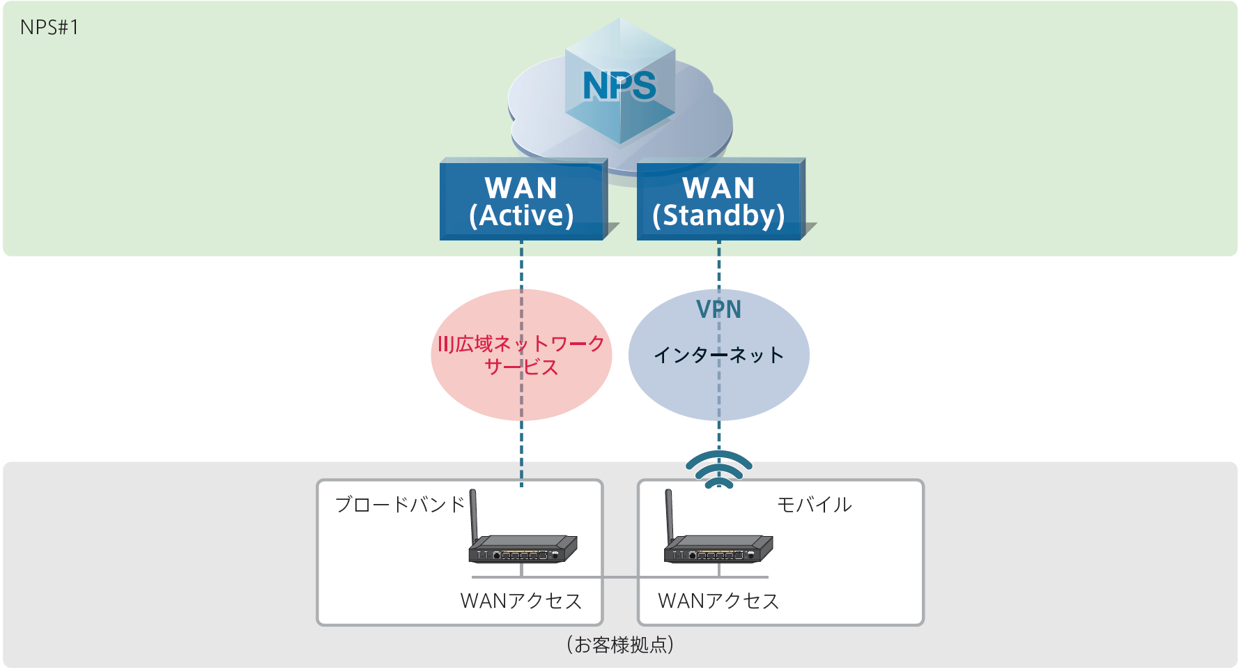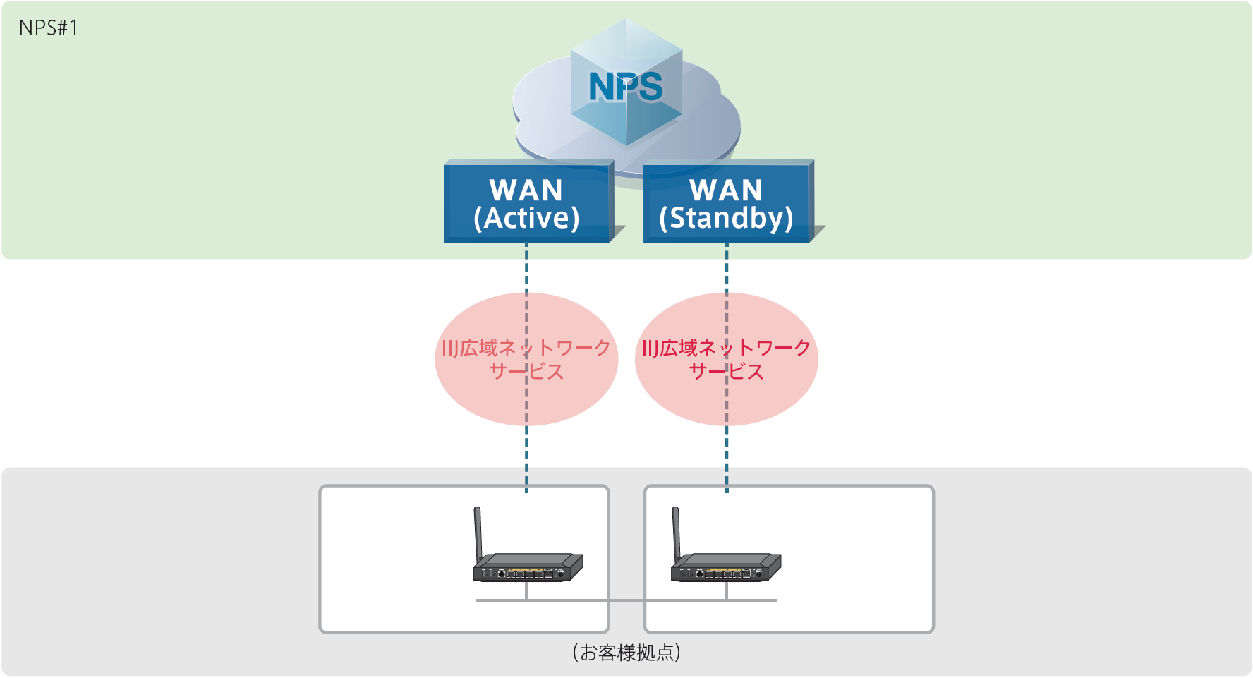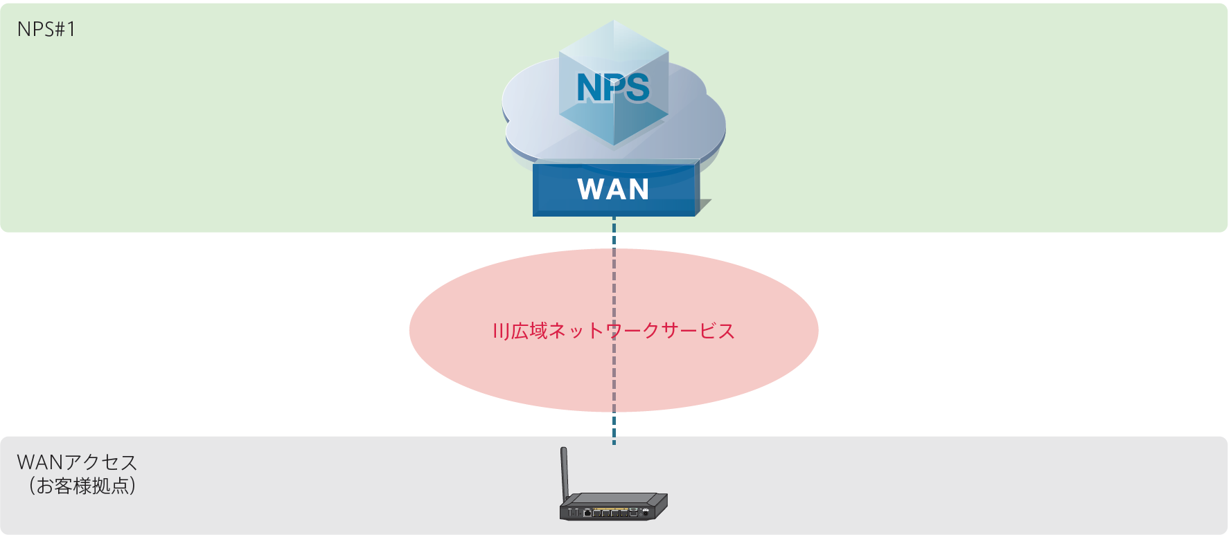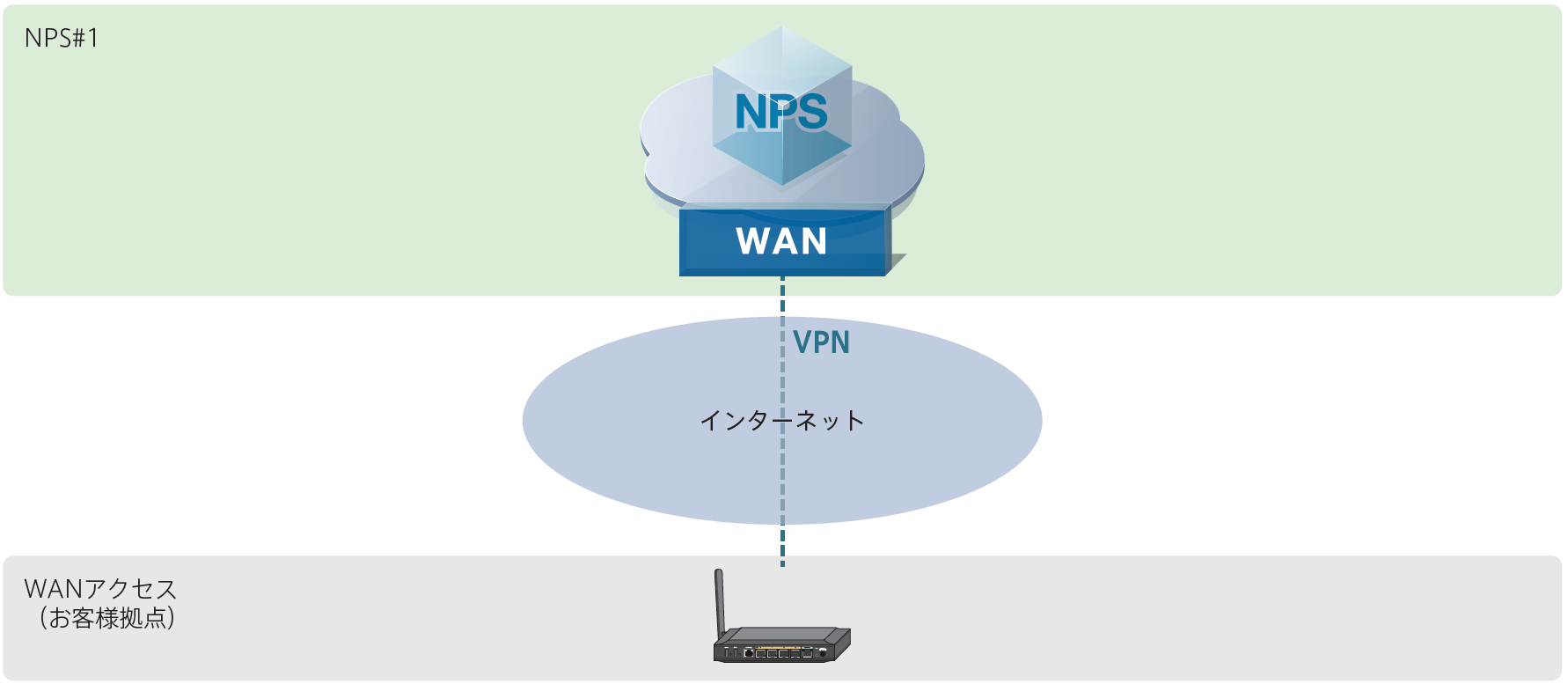 1つのNPSに1つのWANモジュールを追加し、お客様拠点ごとに1つのWANアクセスを利用する構成例です。冗長性はありません。お客様拠点の回線を、回線品目から選択できます。
