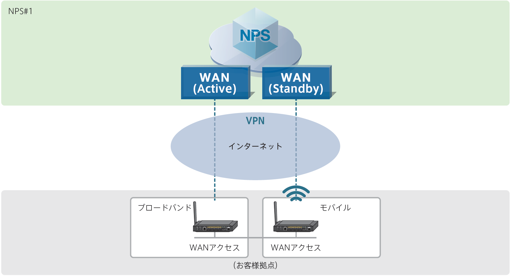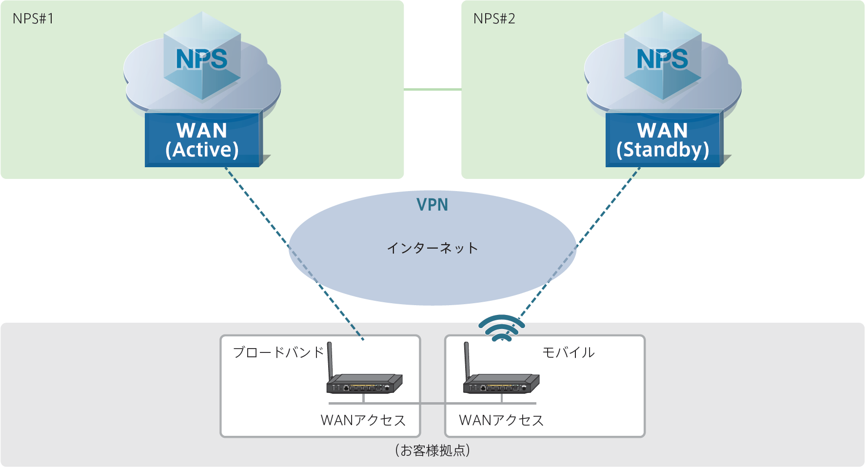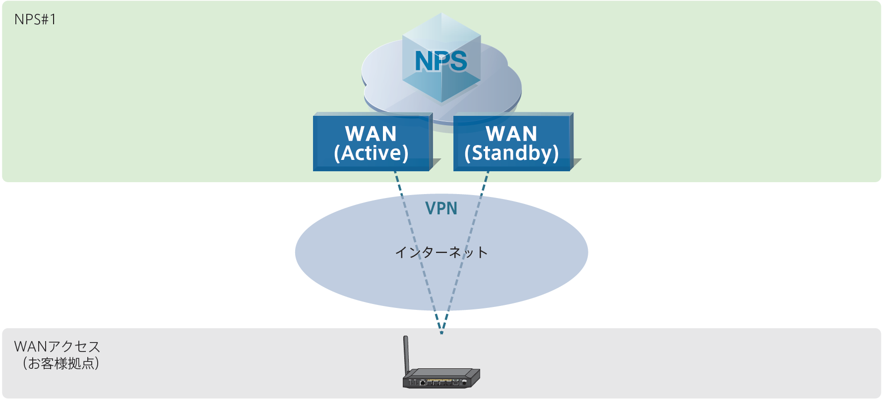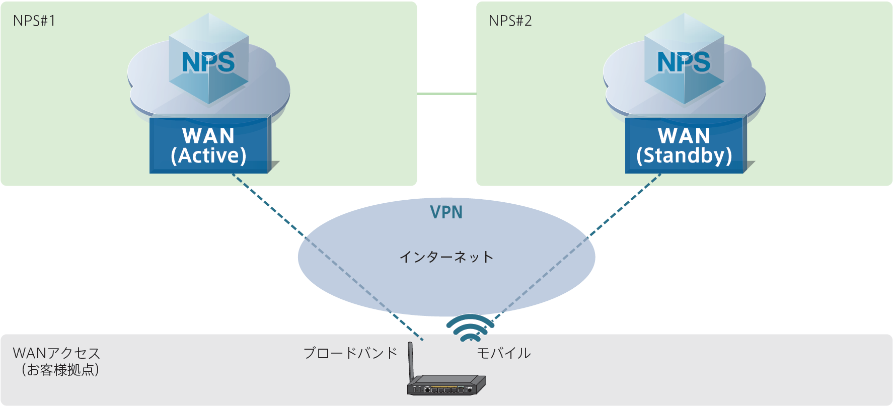 1つのNPSにアクティブ・スタンバイのVPN親拠点機能を追加します。アクティブ側が障害などにより停止した場合は、自動的にスタンバイ側に切り替える構成です。WANモジュールに耐障害性があります。