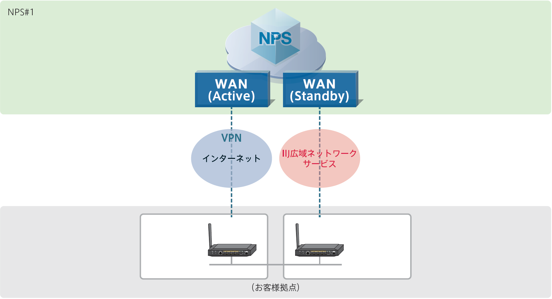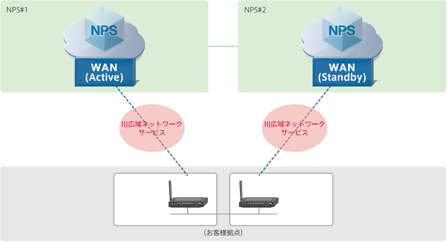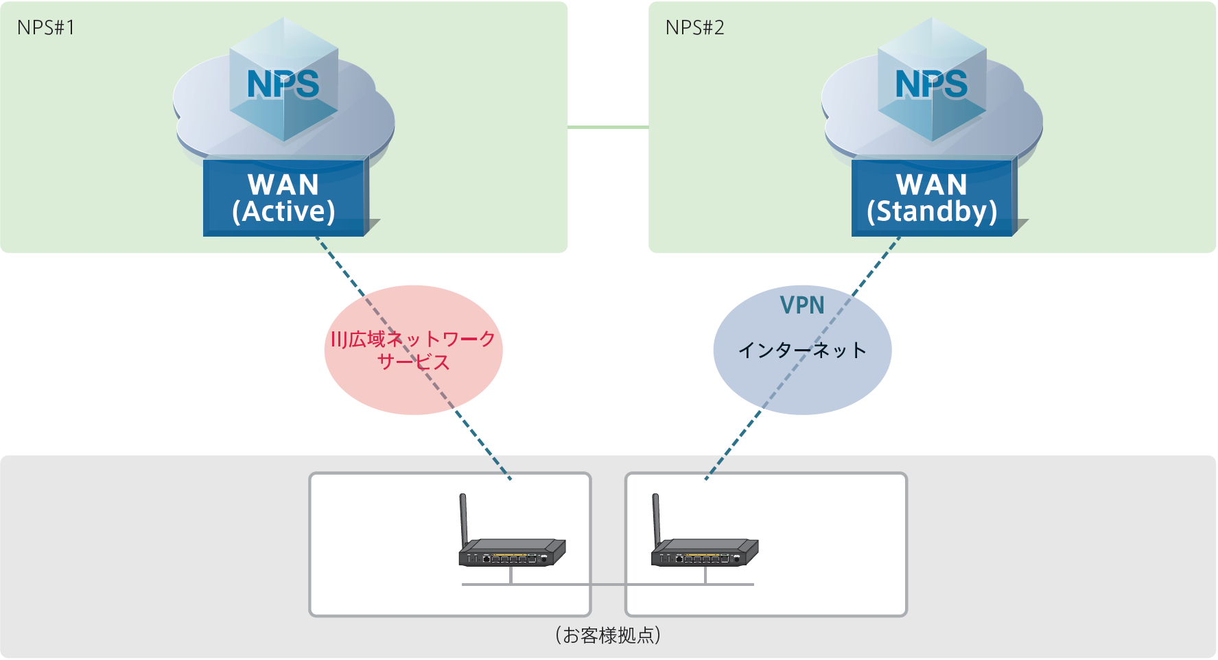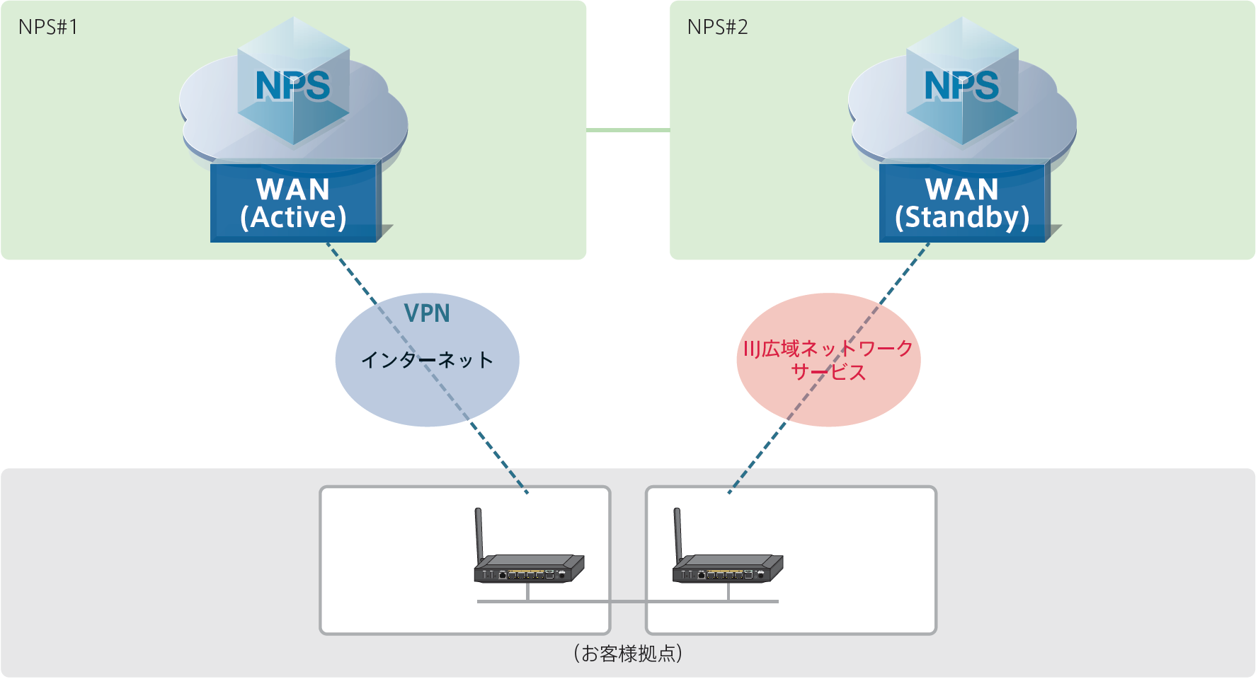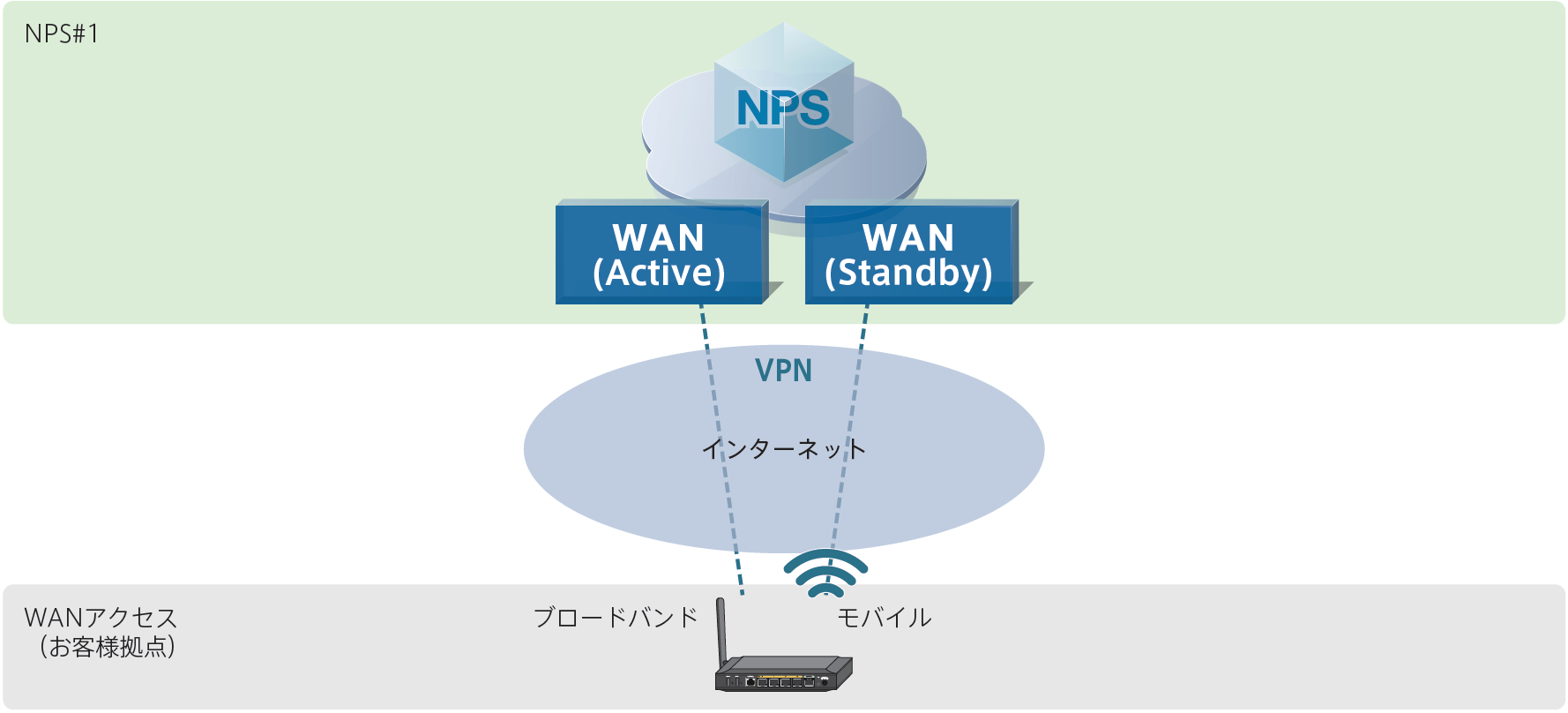1つのNPSにアクティブ・スタンバイのVPN親拠点機能を追加します。アクティブ側が障害などにより停止した場合は、自動的にスタンバイ側に切り替える構成です。WANモジュールに耐障害性があります。
