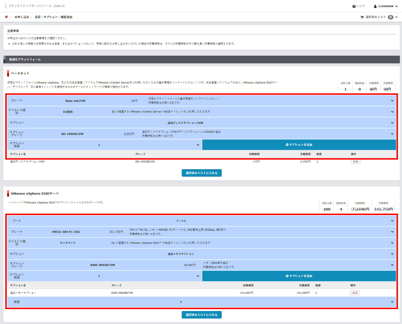 お申し込みできる品目の詳細は、『IIJ GIOインフラストラクチャーP2 Gen.2 デディケイテッドサーバリソース(Gen.2)仮想化プラットフォーム VWシリーズ 仕様書』の「サービスメニュー」の「ご契約数と標準提供数」をご覧ください。