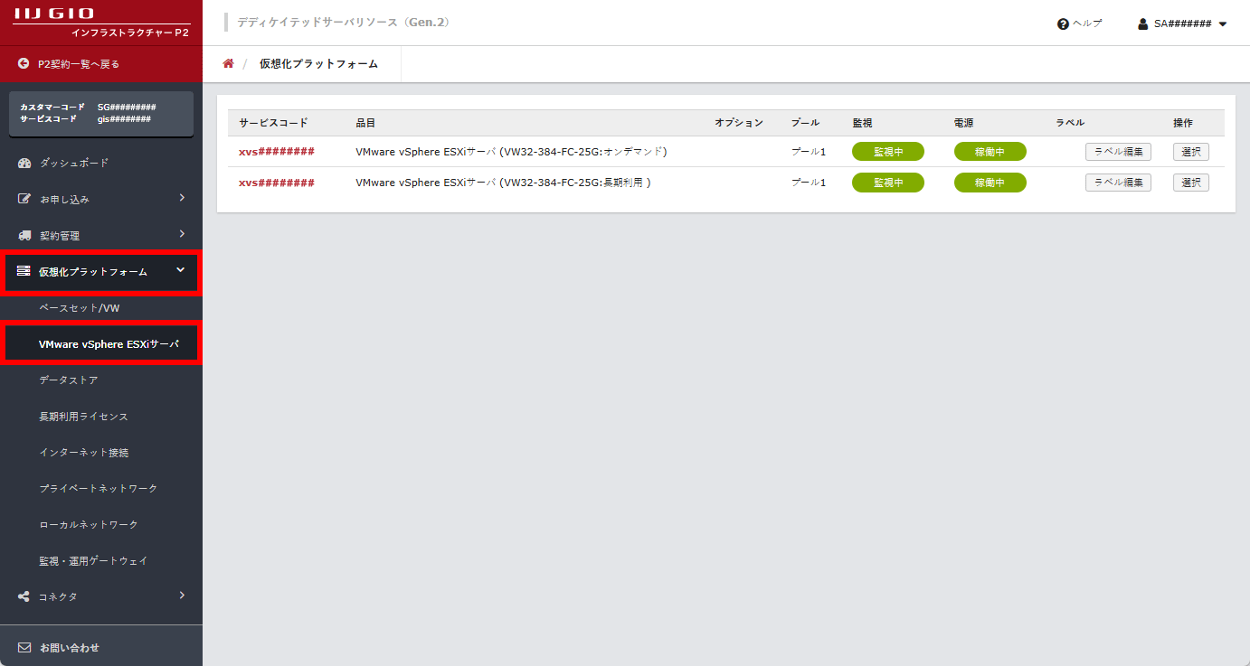 「仮想化プラットフォーム」画面に、ご契約中のVMware vSphere ESXiサーバが表示されます。