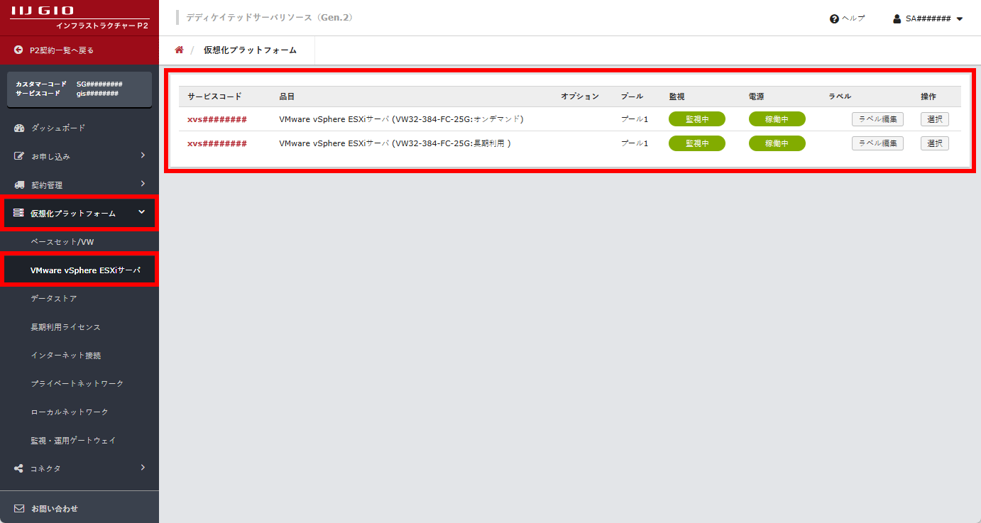 画面左に表示されるメニューの「仮想化プラットフォーム」をクリックし、「VMware vSphere ESXiサーバ」をクリックすると、「仮想化プラットフォーム」画面に、ご契約中のESXiサーバが表示されます。
