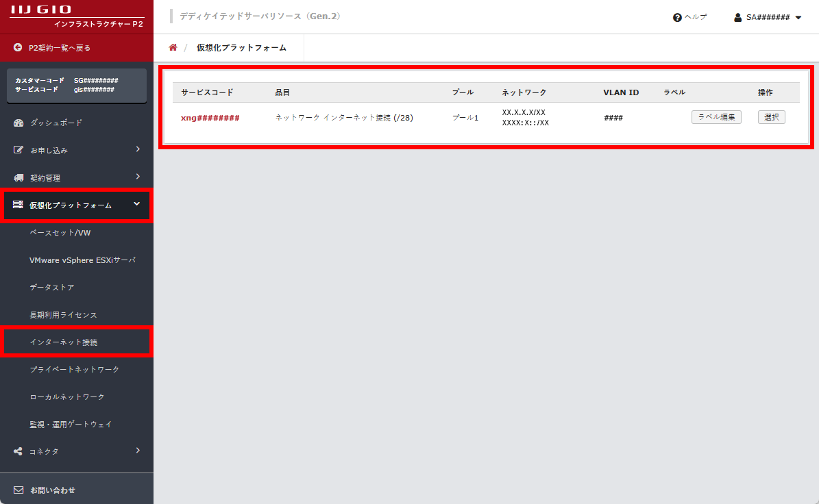 画面左に表示されるメニューの「仮想化プラットフォーム」をクリックし、「インターネット接続」をクリックすると、「仮想化プラットフォーム」画面に、ご契約中の「インターネット接続」が表示されます。