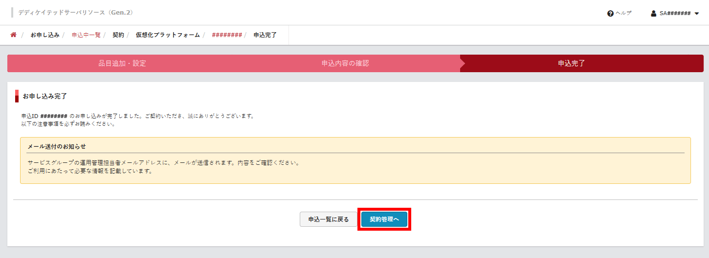 「申込完了」画面が表示され、サービスグループの運用管理担当者のメールアドレスに確認のメールが送信されます。