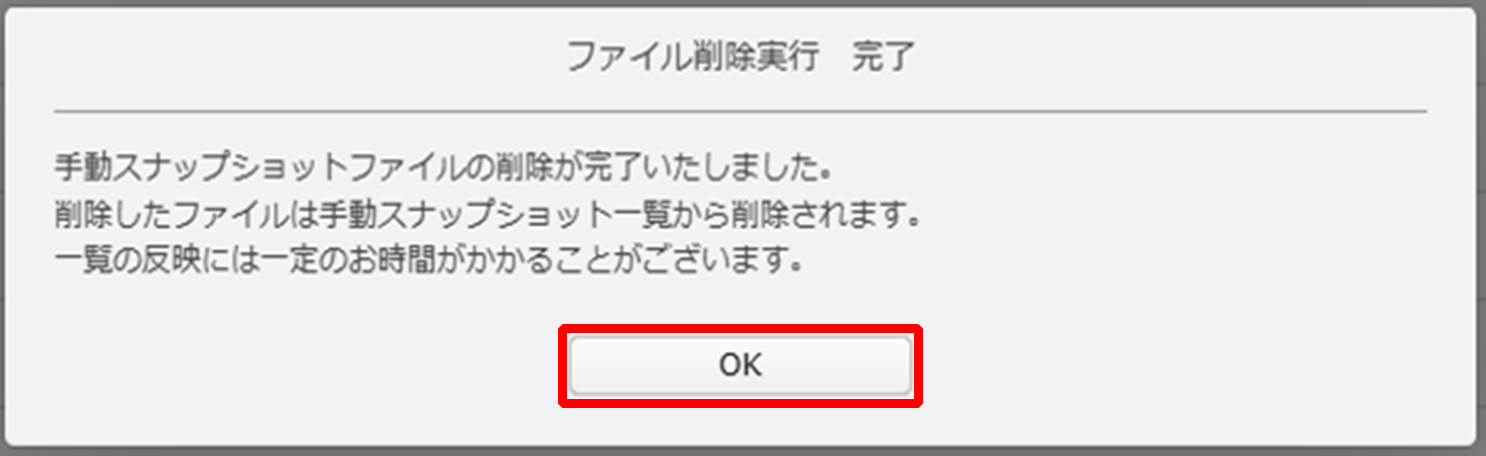 3. スナップショットファイル一覧で削除するスナップショットファイルのチェックボックスをチェックし、「ファイル削除実行」をクリックします。