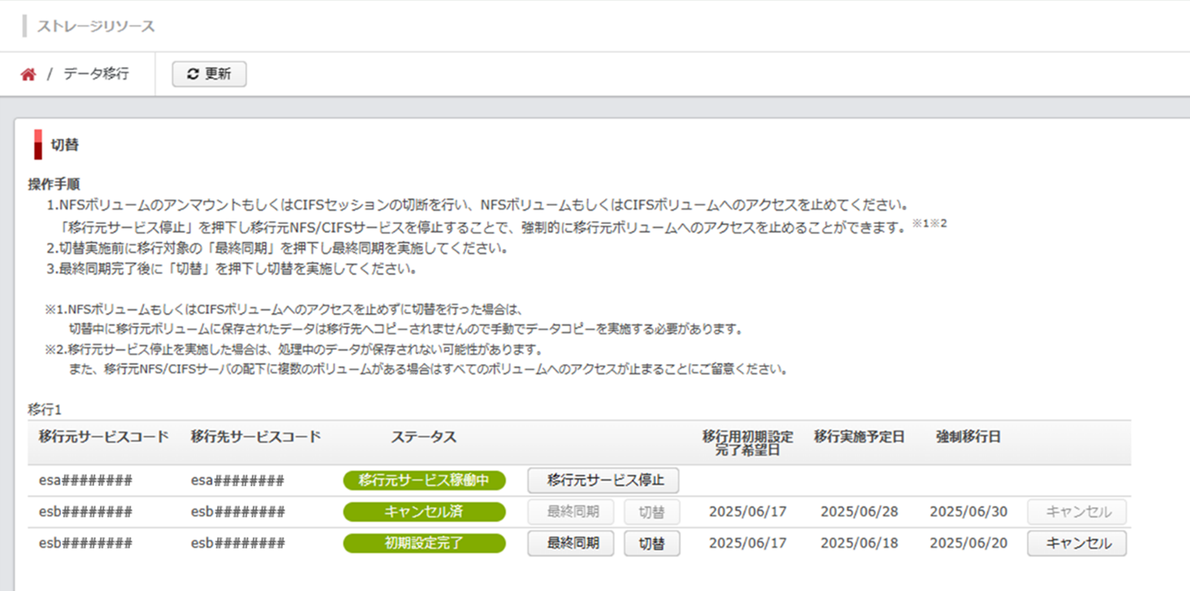 「切替」をクリックすると、「ステータス」に「切替中」が表示され、切替が完了すると「移行完了」が表示されます。