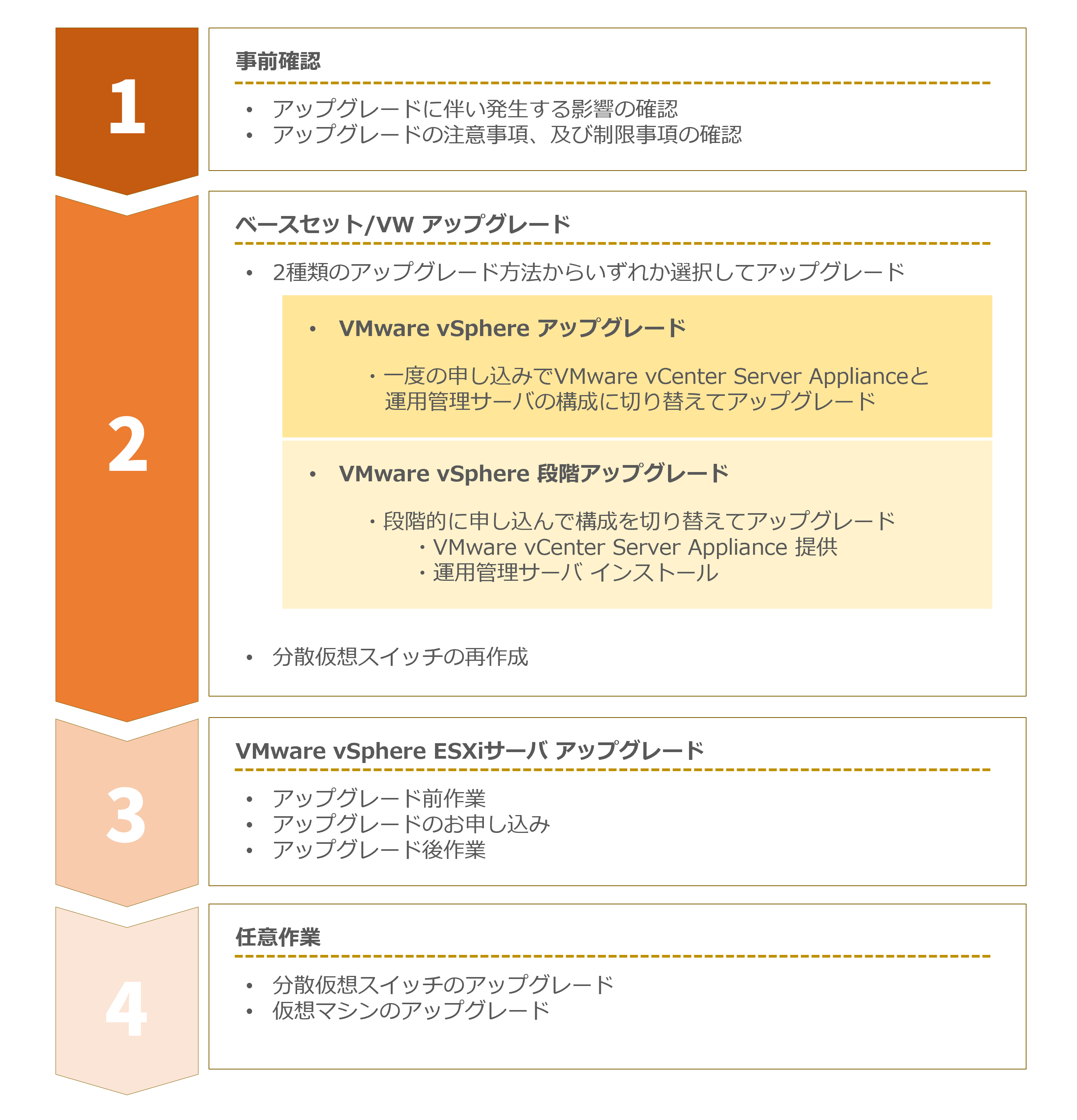 VMware vSphereアップグレードで、お客様に実施していただく作業は以下のとおりです。