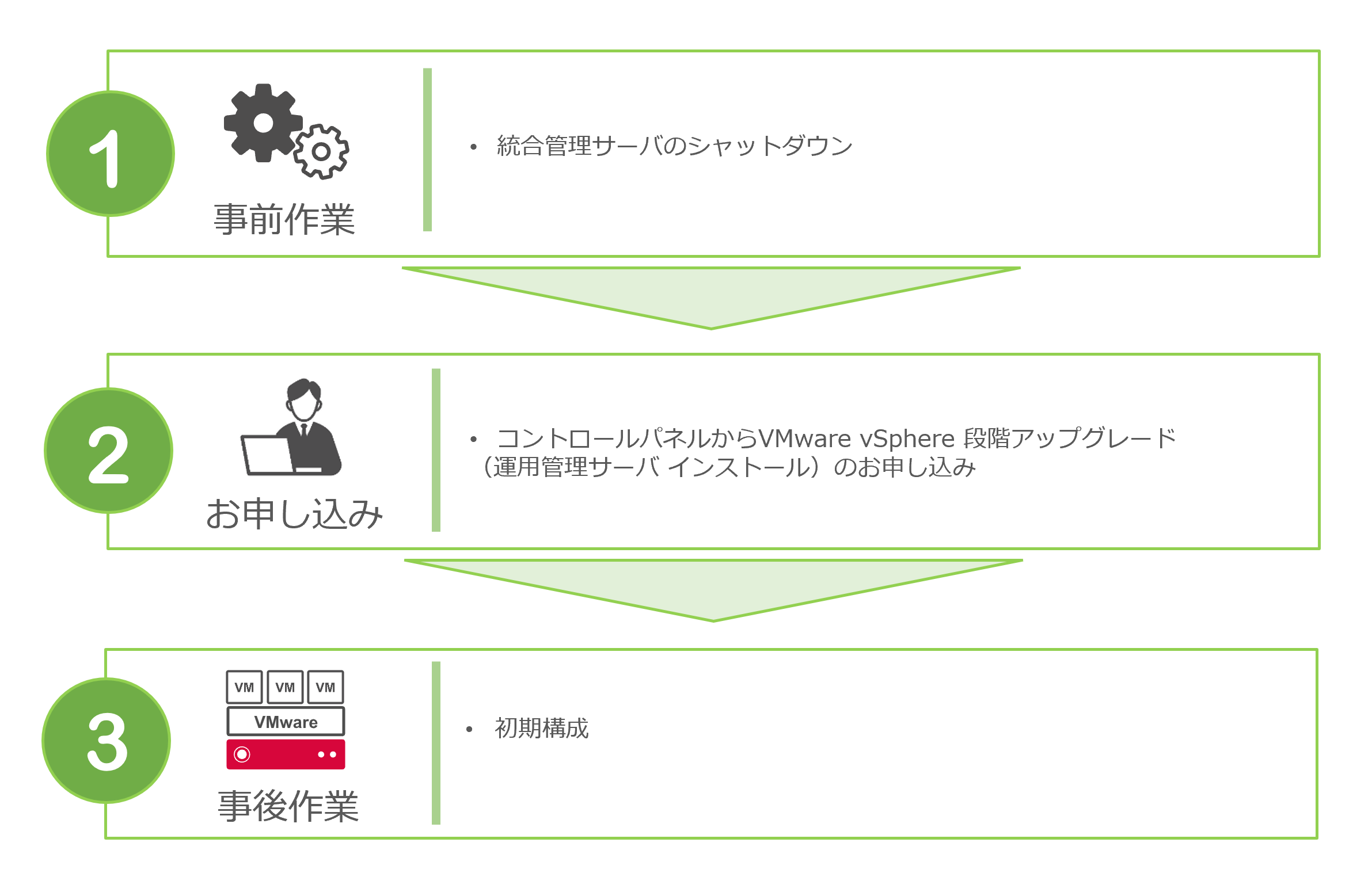 VMware vSphere 段階アップグレード(運用管理サーバ インストール)をお申し込みいただいた後に、実施する作業を説明します。
