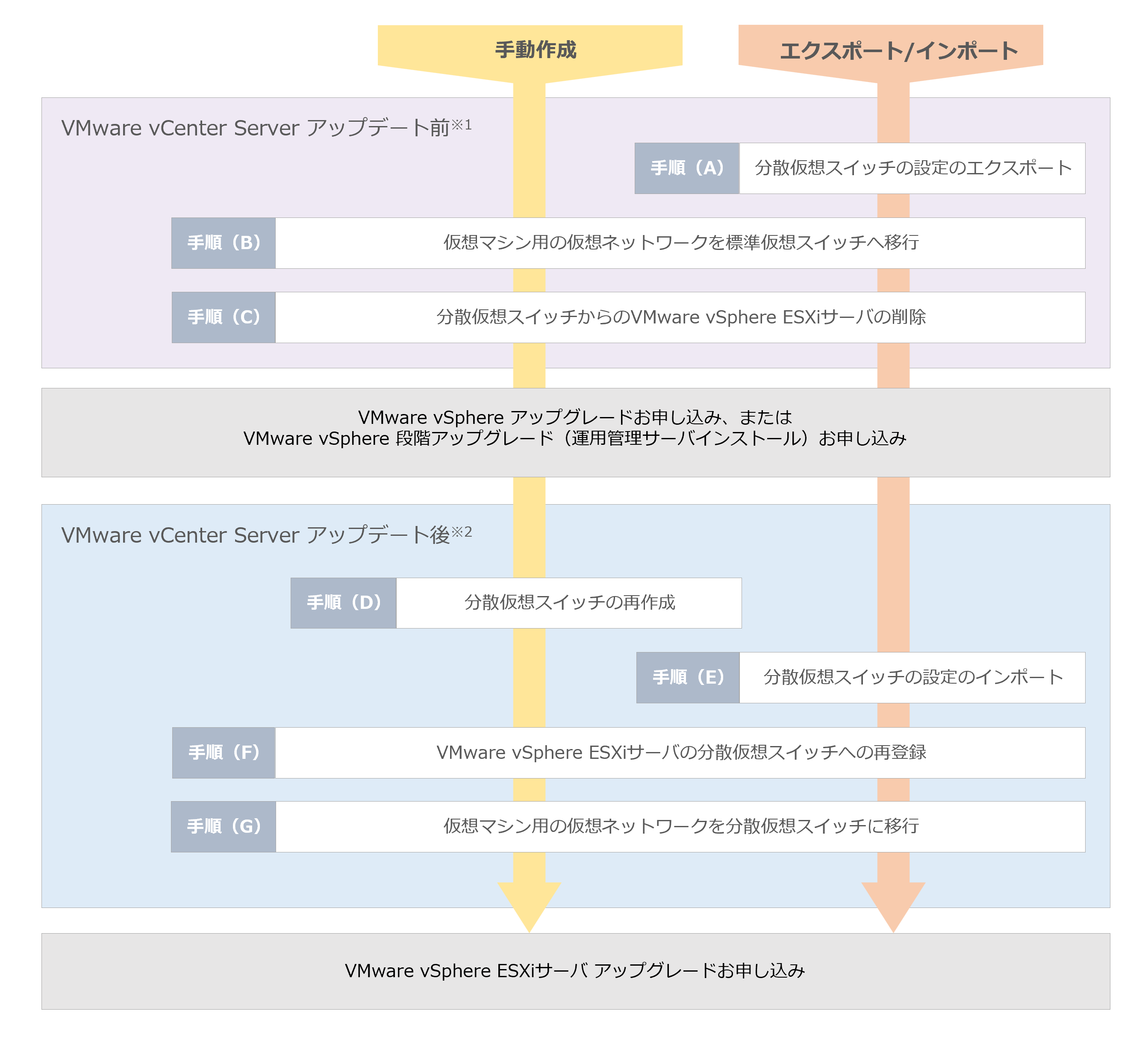 VMware vSphere アップグレード、及びVMware vSphere 段階アップグレード(運用管理サーバ インストール)のお申し込みに併せて、分散仮想スイッチを再作成し、アップグレードします。