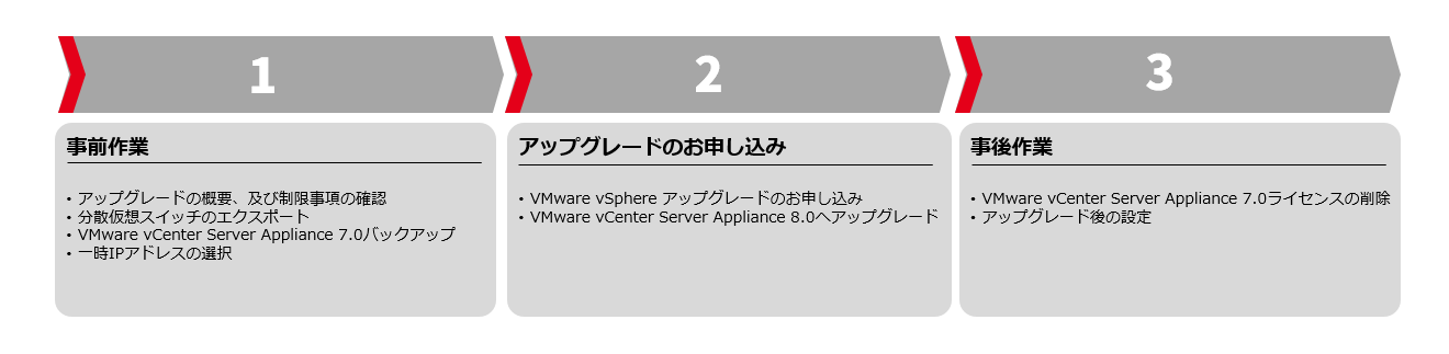 - VMware vCenter Server Appliance 8.0へのアップグレードはご使用の環境の既存の構成を保持した形でのアップグレードとなります。従来のアップグレード方法を実施されたいお客様は、vSphere 7.0へのアップグレードを参考にしてください。