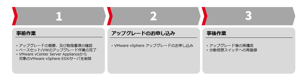 VMware vSphere ESXiサーバをアップグレードする際の、事前作業、お申し込み、及び事後作業を説明します。
