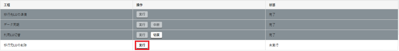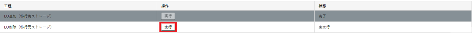 9.「LU削除(移行元ストレージ)」の「操作」で「実行」をクリックします。