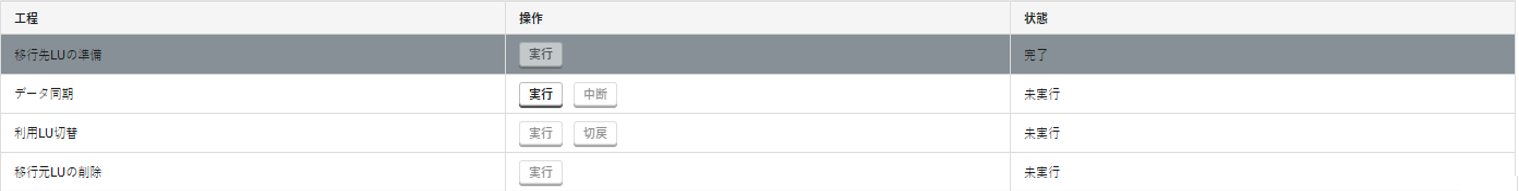 6. 「移行先LUの準備」の「状態」に「完了」が表示されていることを確認します。