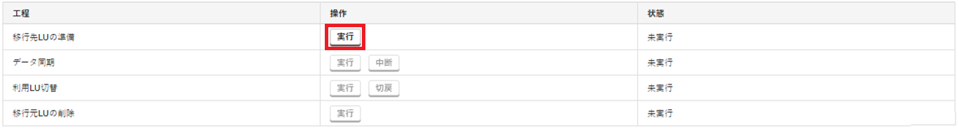 4. 「移行先LUの準備」の「操作」で「実行」をクリックします。