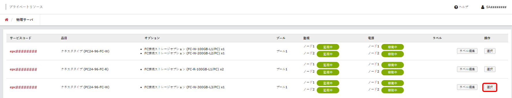 「物理サーバ」画面に、ご契約中のクラスタタイプが表示されます。