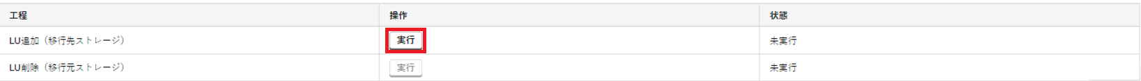 5. 「LU追加(移行先ストレージ)」の「操作」で「実行」をクリックします。