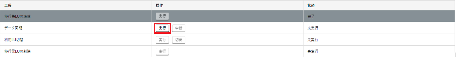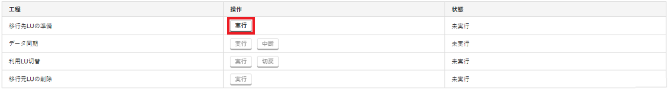 2. 「移行先LUの準備」の「操作」で「実行」をクリックします。