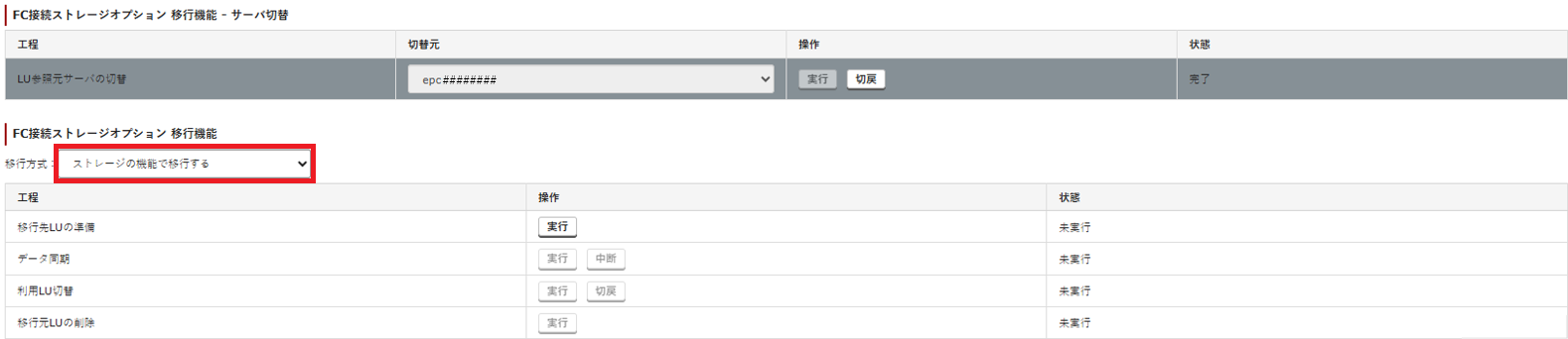 1. 「FC接続ストレージオプション 移行機能」の「移行方式」で「ストレージの機能で移行する」を選択します。