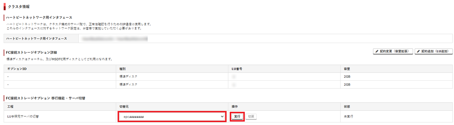 7. 「FC接続ストレージオプション 移行機能-サーバ切替」の「切替元」で切り替え元のサービスコードを選択し、「操作」で「実行」をクリックします。