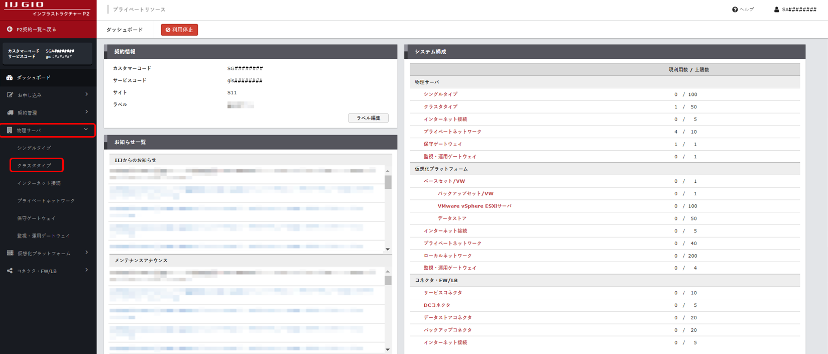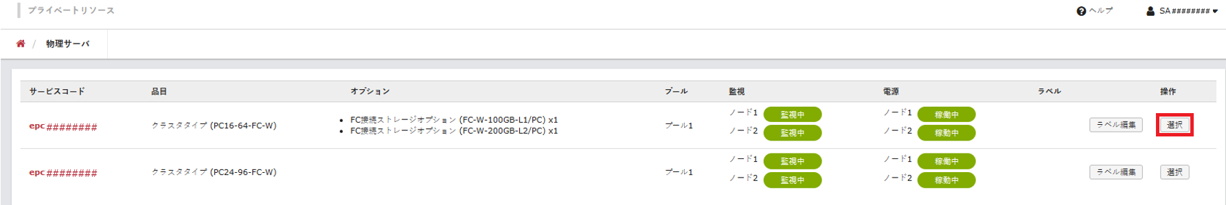 「物理サーバ」画面に、ご契約中のクラスタタイプが表示されます。