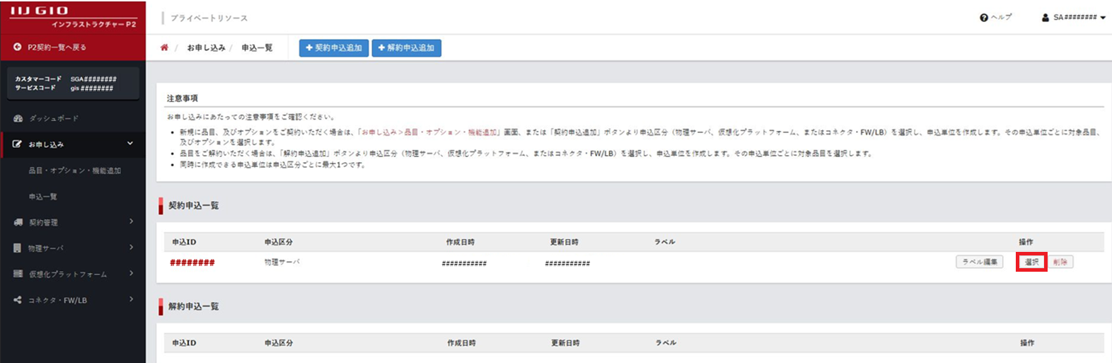 3. 「契約申込一覧」の申込単位の「選択」をクリックします。