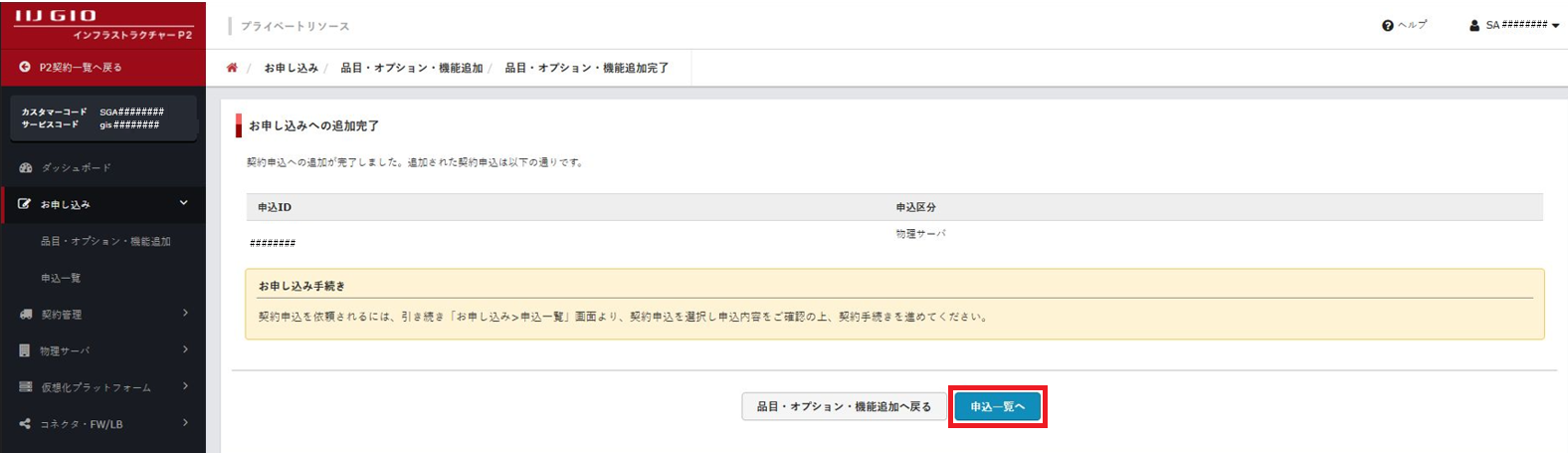 「品目・オプション・機能追加完了」画面が表示されます。