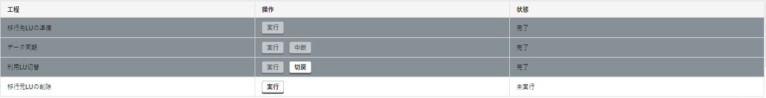 移行先LUへのアクセスが正常に行えない場合は切り戻しを実施してください。利用LU切替の切り戻し方法は「利用LUの切り戻し」をご覧ください。
