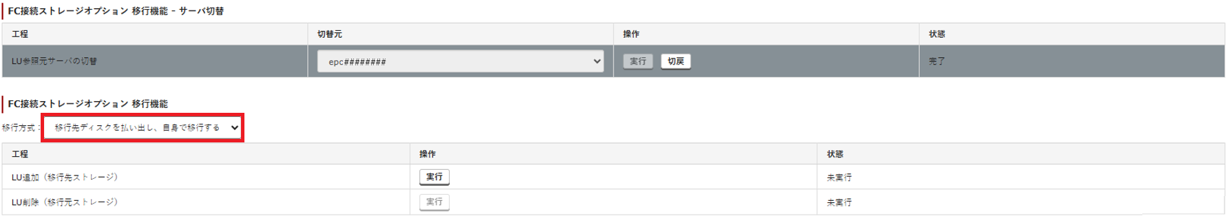 1. 「FC接続ストレージオプション 移行機能」の「移行方式」で「移行先ディスクを払い出し、自身で移行する」を選択します。
