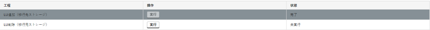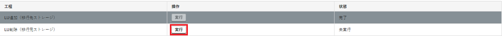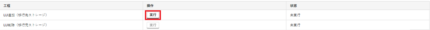 2. 「LU追加(移行先ストレージ)」の「操作」で「実行」をクリックします。