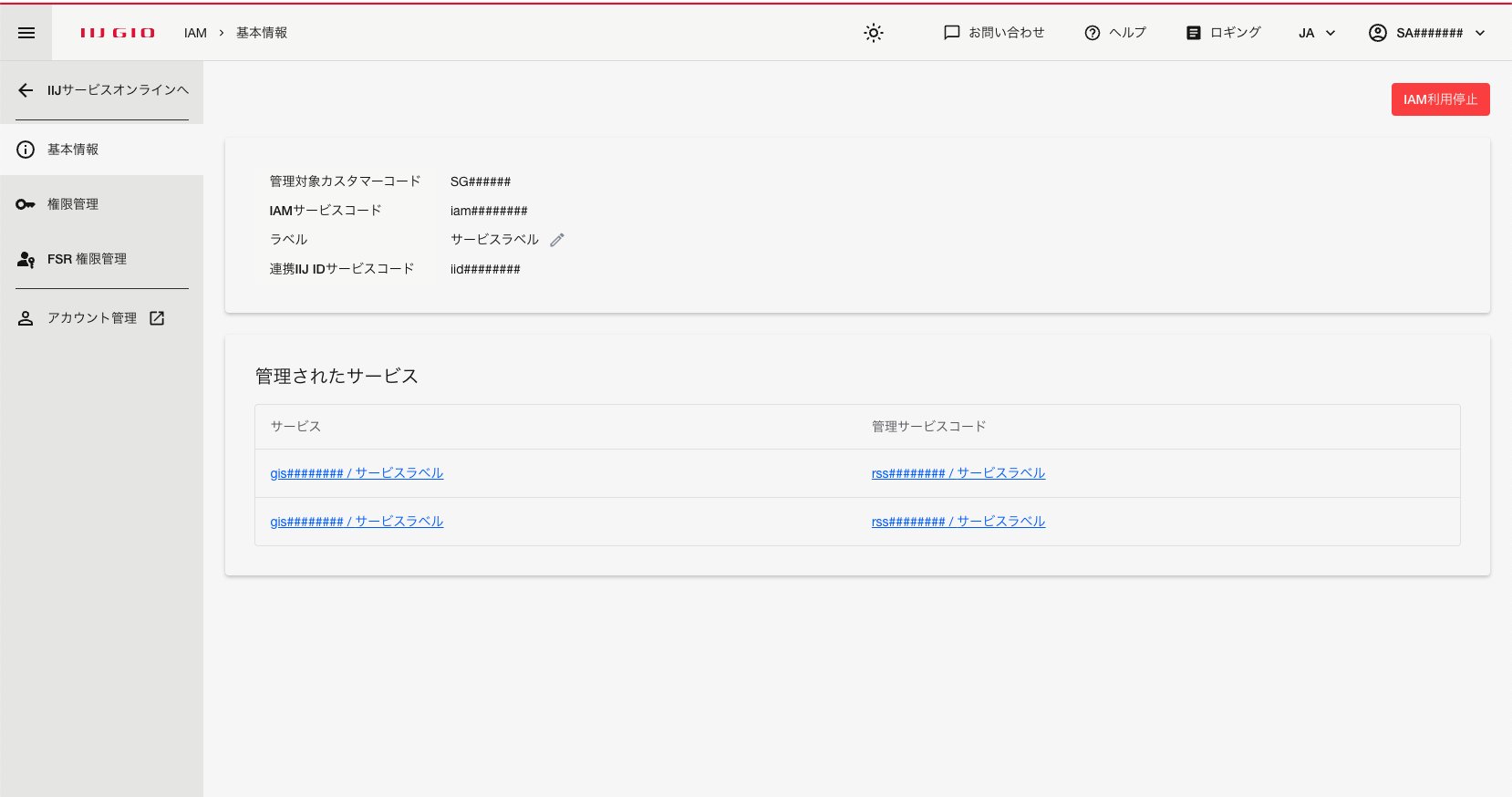| 基本情報画面 | IIJ IDサービスとの連携状態、連携中のIIJ IDサービスの情報、及び管理対象サービスを確認できます |
