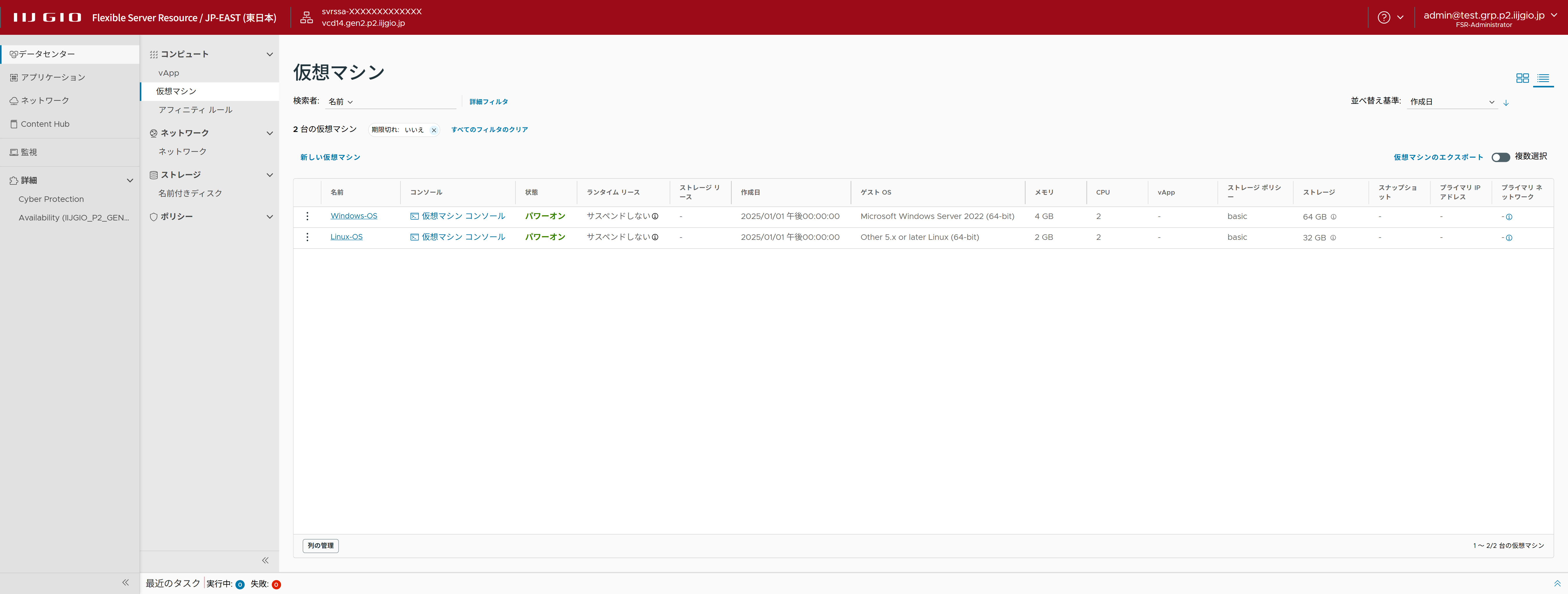 | ストレージポリシー | 「basic」、「standard」など、仮想マシンが使用しているブロックストレージの種類です |