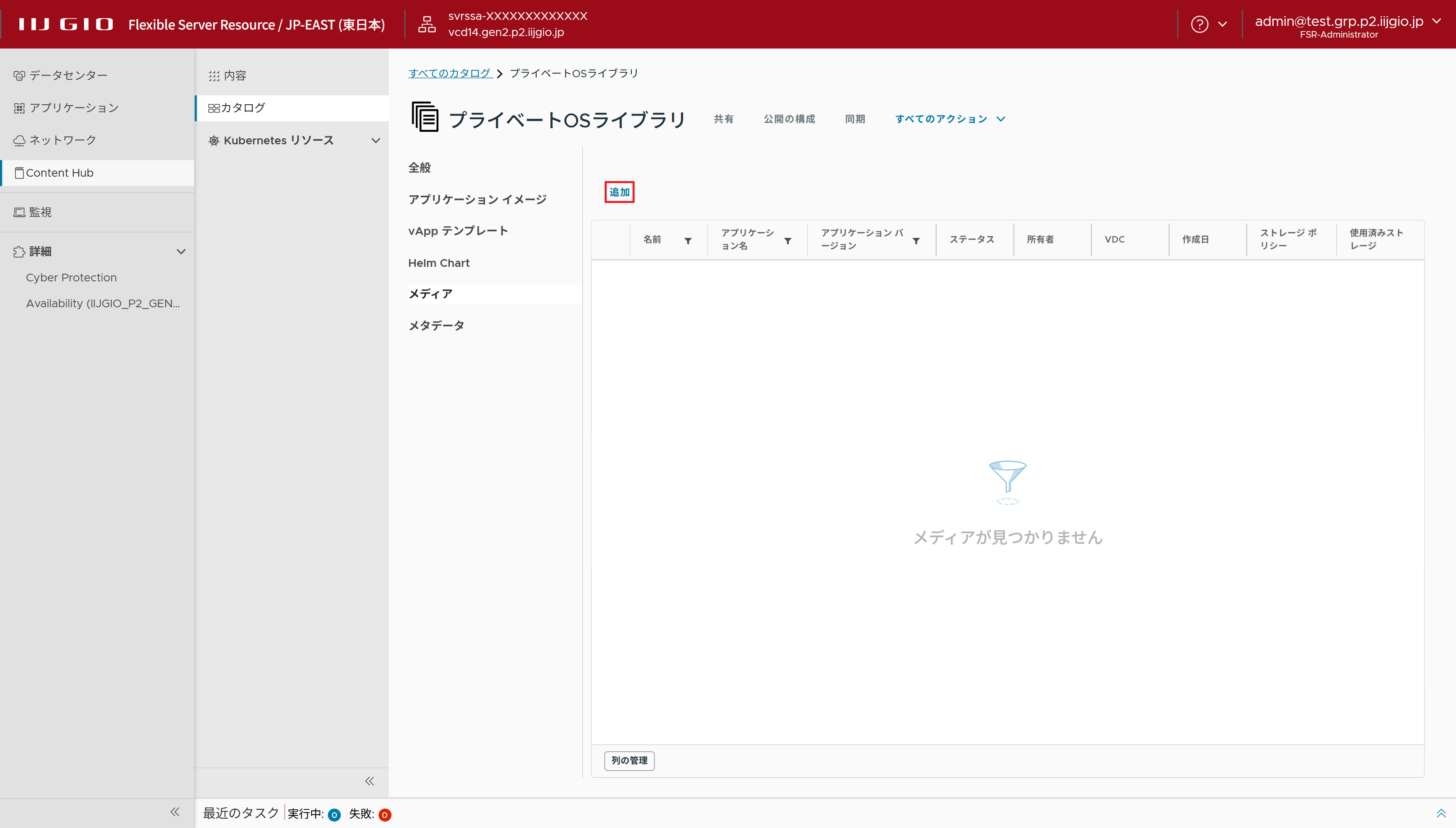 1.「プライベートOSライブラリ」画面の「メディア」タブで、「追加」をクリックします。