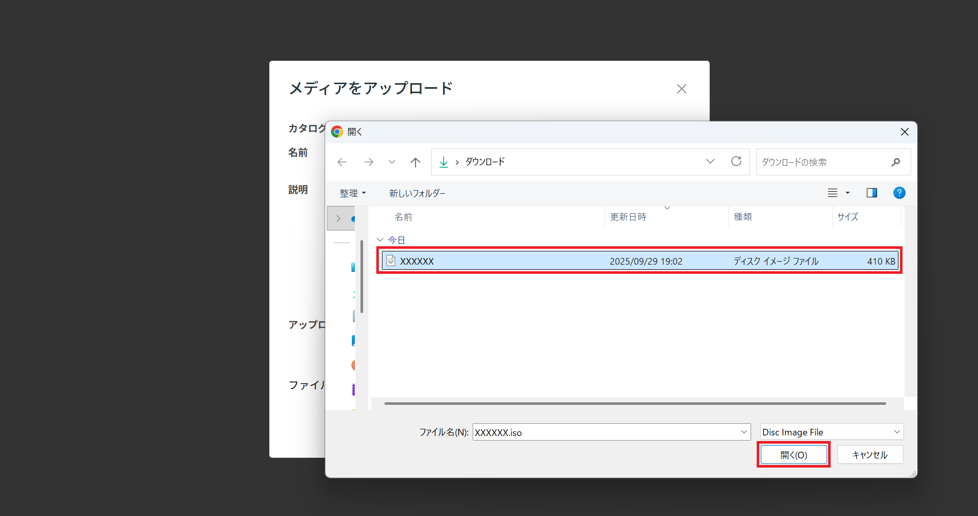 「メディアをアップロード」画面に戻り、「選択したファイル」にインポートするインストールメディアが表示されます。