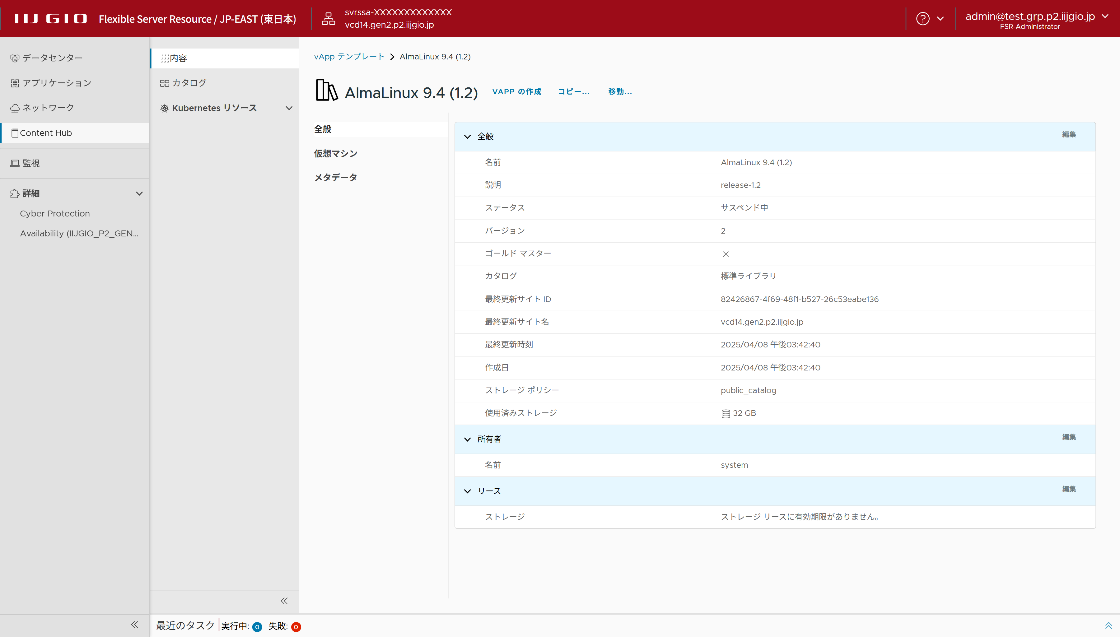 テンプレートの詳細情報が表示されます。また、本画面でvAppの作成、リース設定の更新、及びテンプレートの削除が行えます。