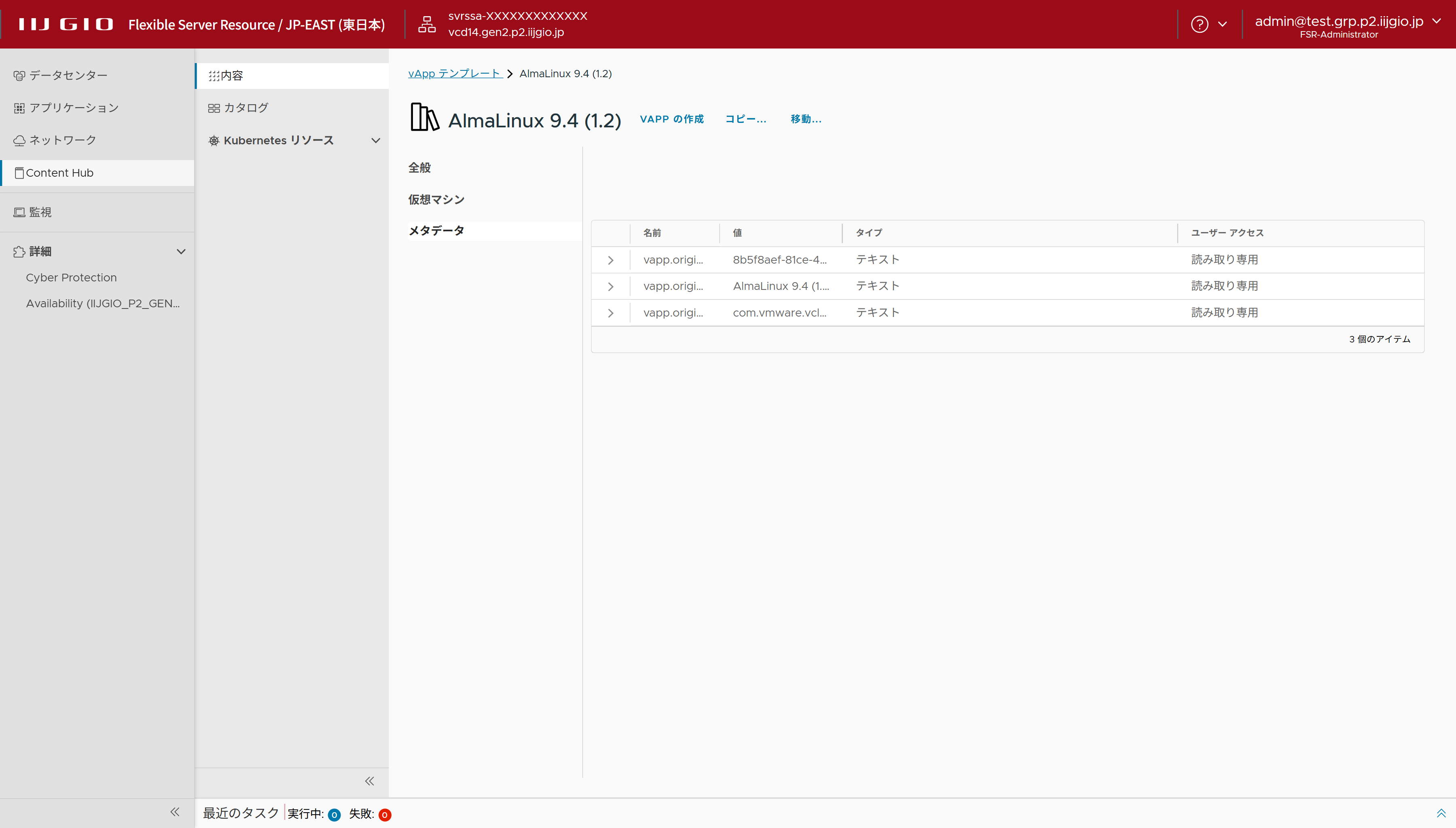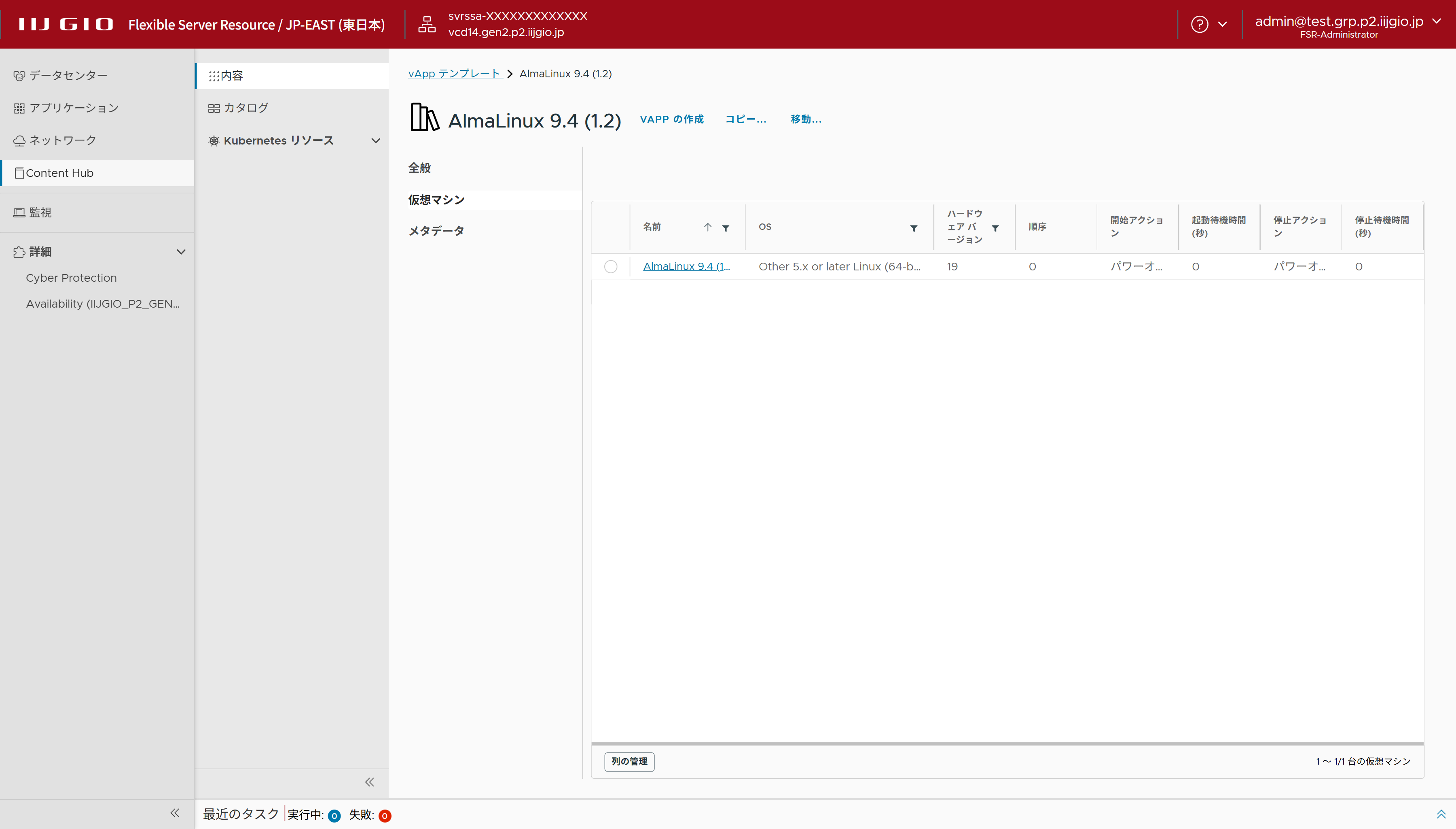 「vAppテンプレート」画面でテンプレートの「名前」列をクリックすると、テンプレートの詳細画面が表示されます。