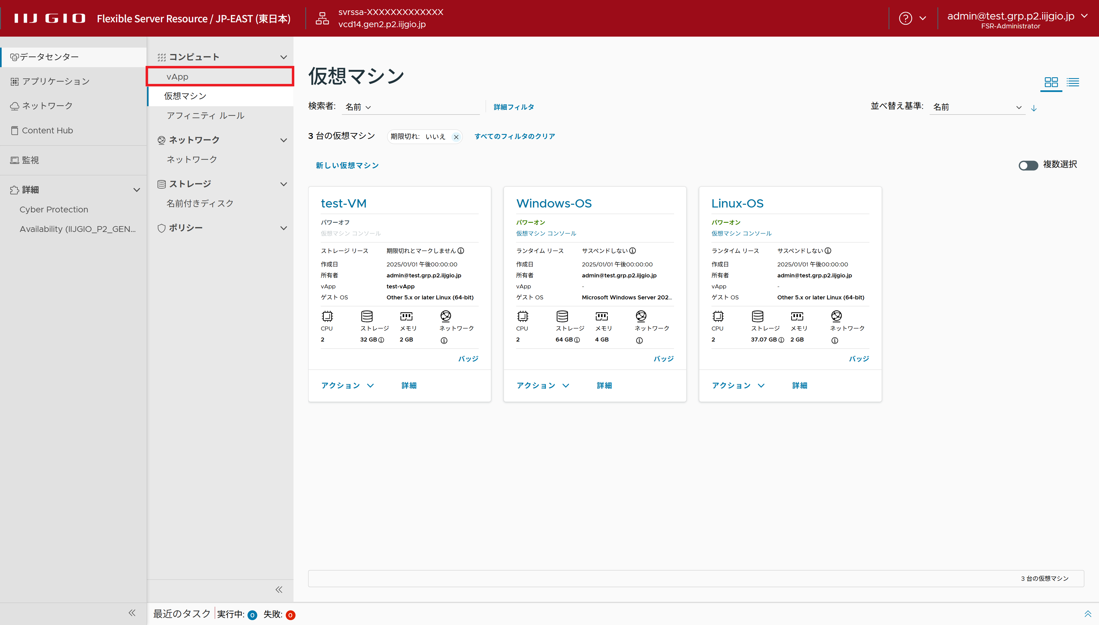 1.「仮想マシン」画面の左側で、「vApp」をクリックします。