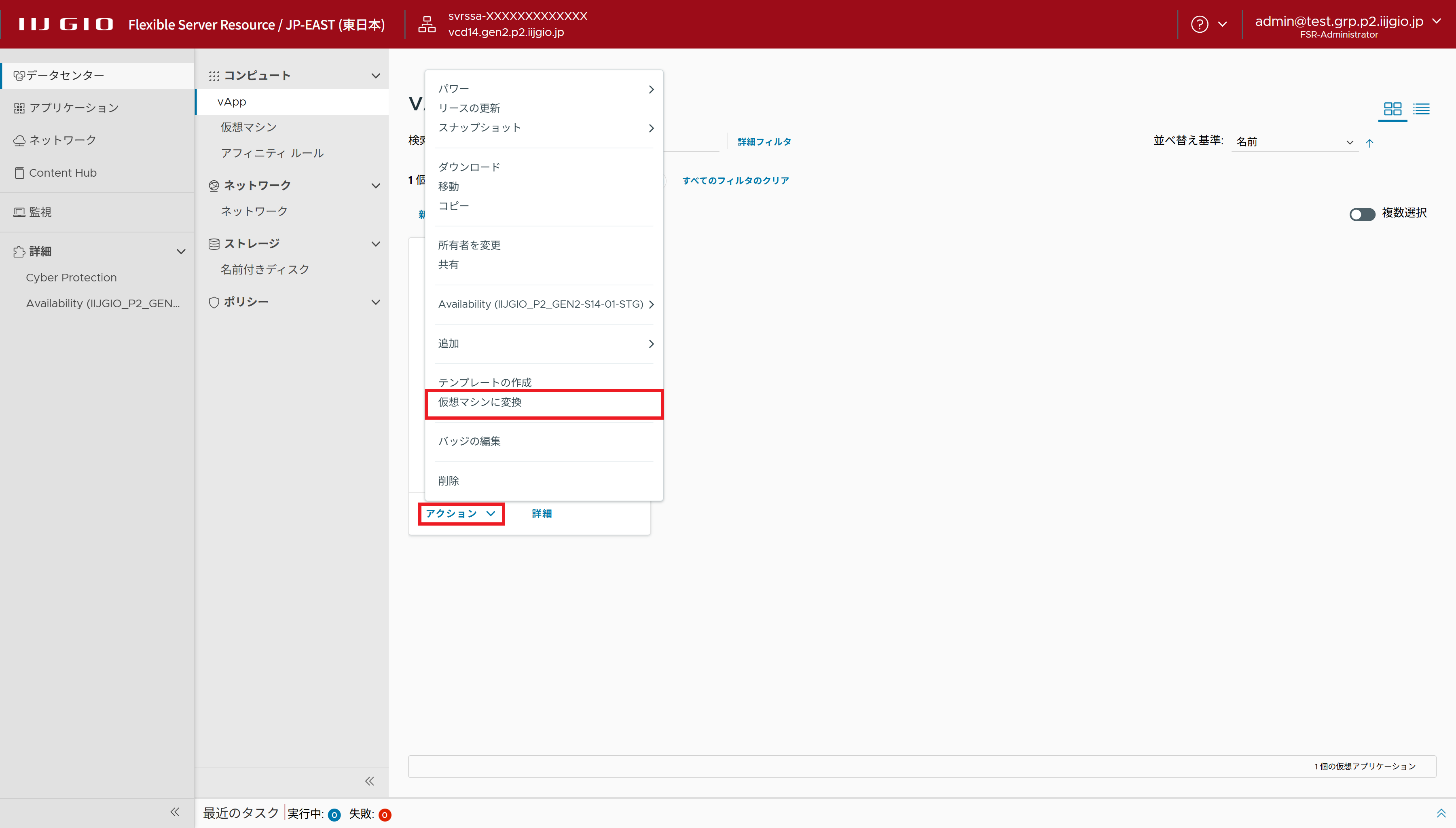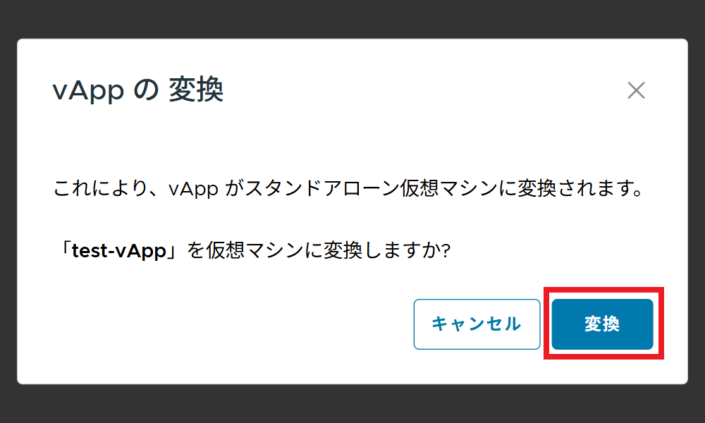 - vAppに2台以上の仮想マシンが含まれる場合は「仮想マシンに変換」が表示されません。