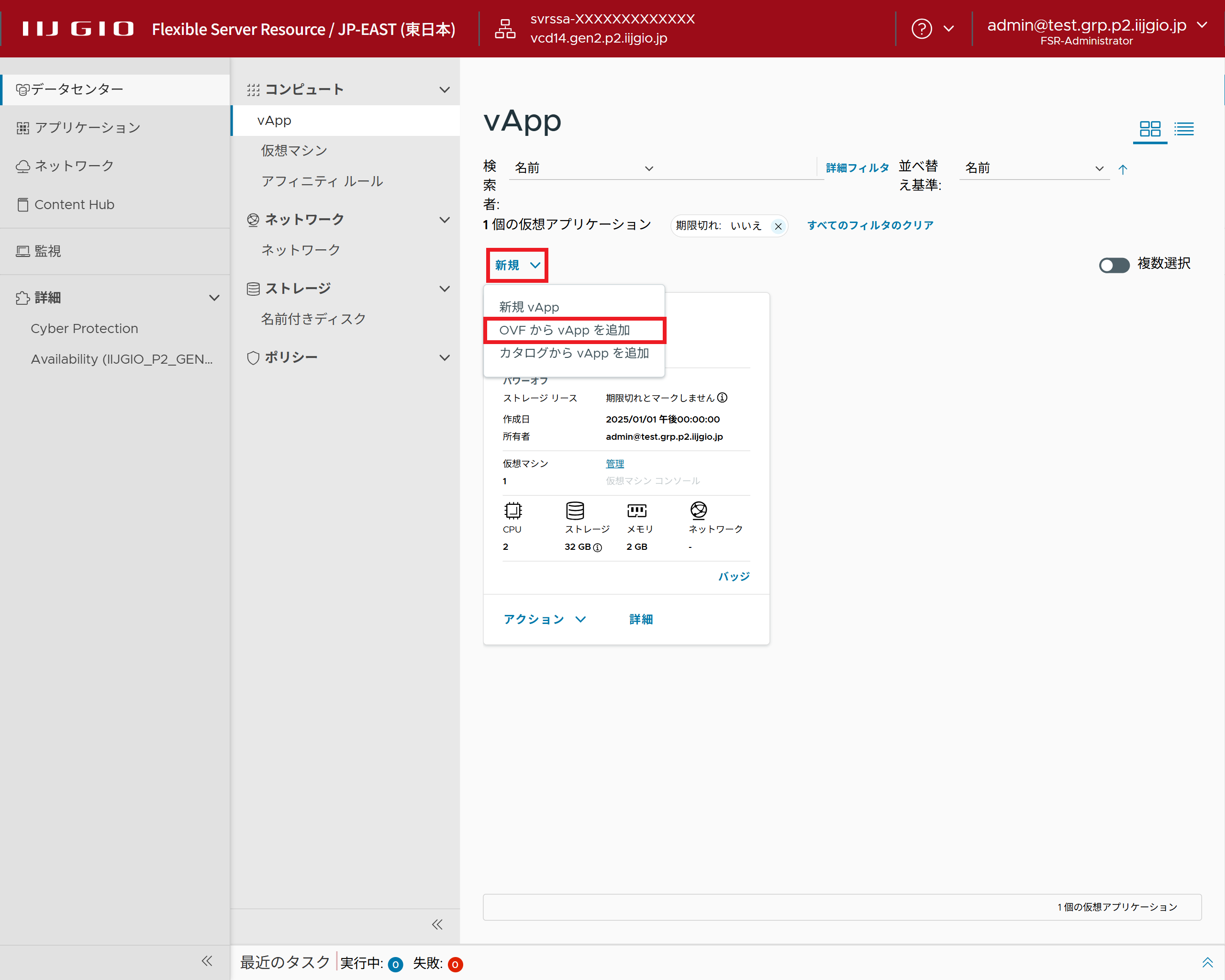 1.「vApp」画面で「新規」、「OVFからvAppを追加」の順にクリックします。