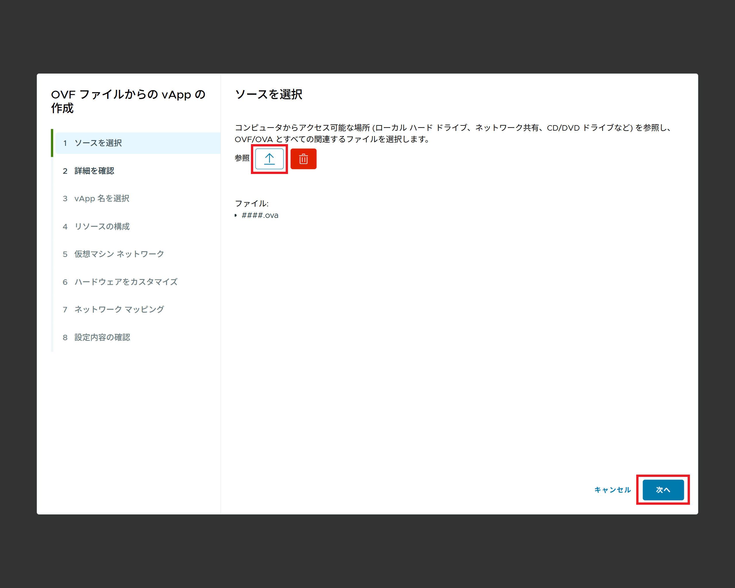 アイコンをクリックし、表示された画面でOVF(OVA)ファイルを選択し、「次へ」をクリックします。