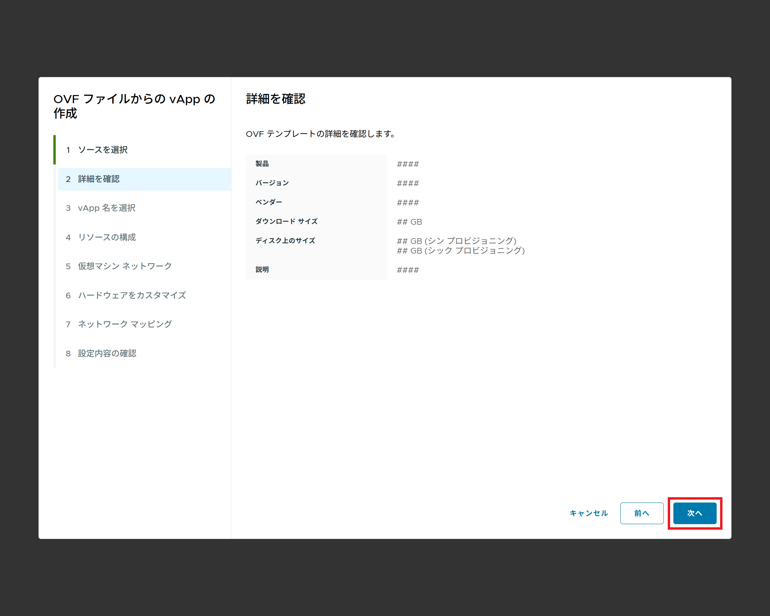 4.任意のvApp名を設定し、「次へ」をクリックします。