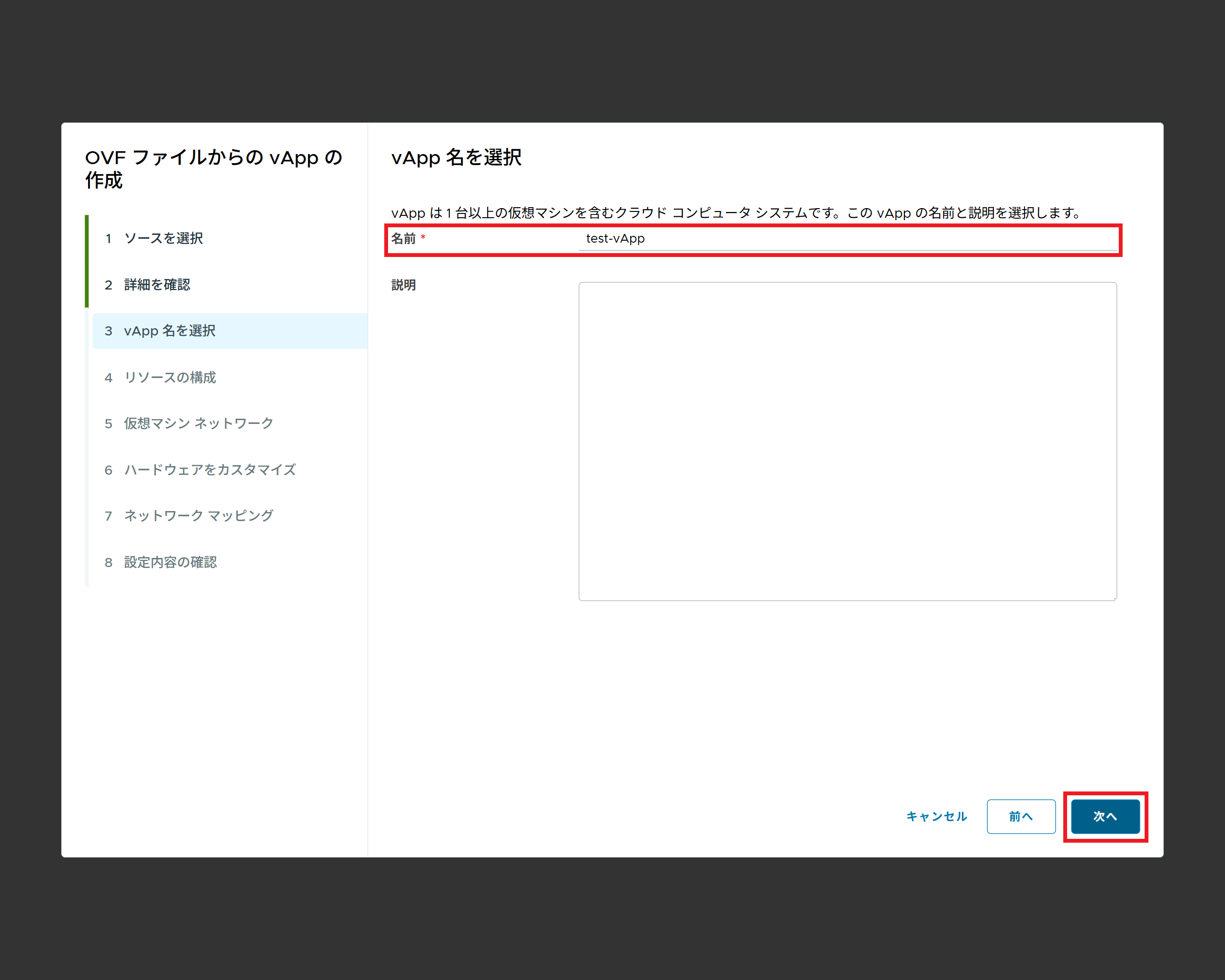 | 名前 | 任意のvApp名を入力します(必須) |