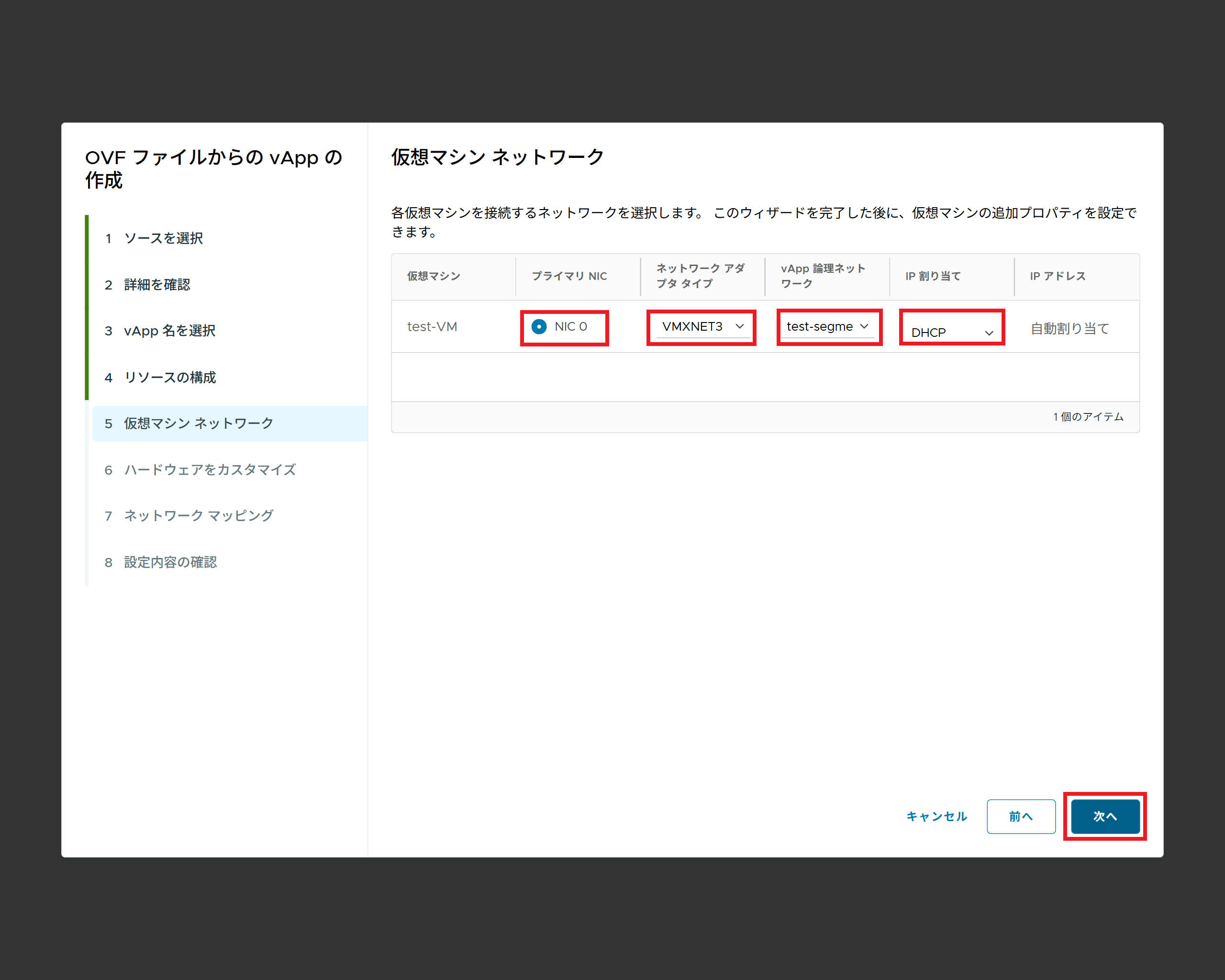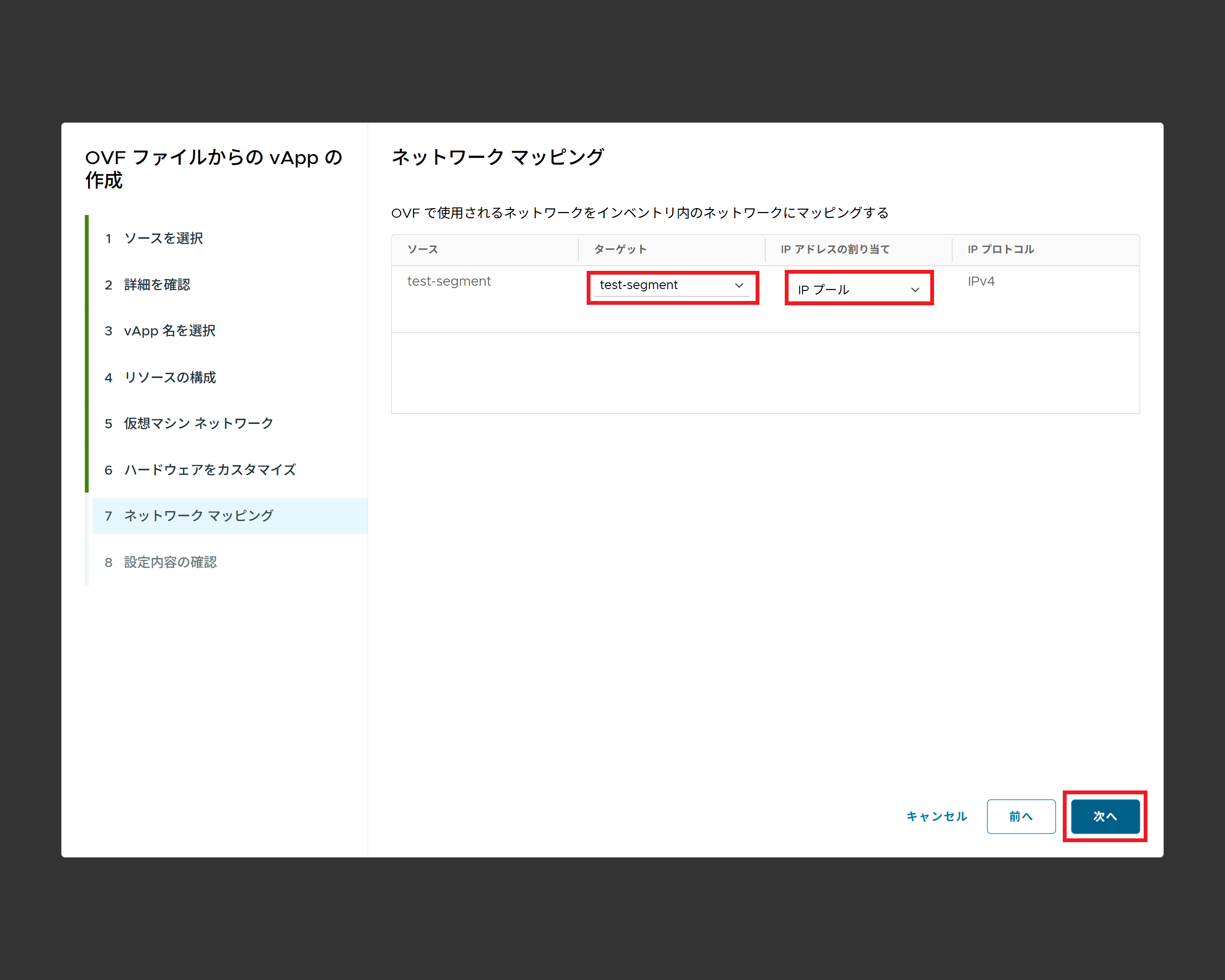 | vApp論理ネットワーク | OVA/OVFファイルで割り当てられていたOVFネットワークを選択します |