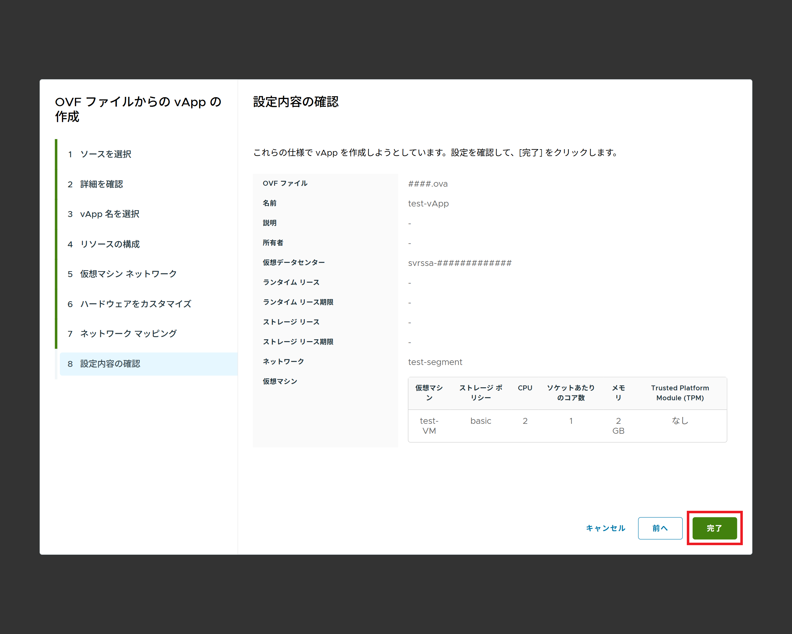 OVF(OVA)ファイルがインポートされ、vAppが作成されます。
