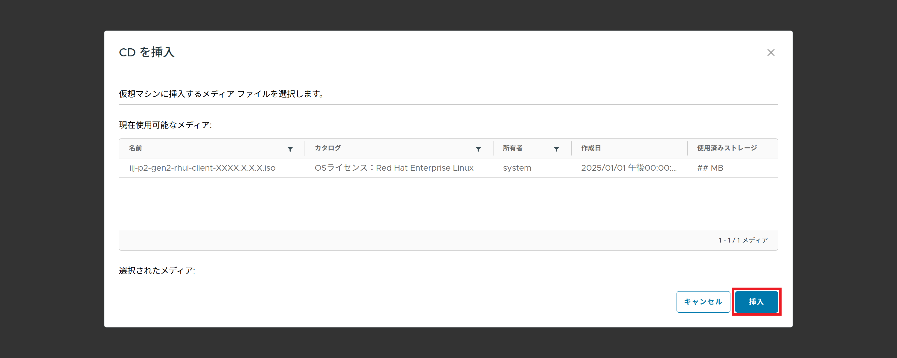4.「iij-p2-gen2-rhui-client-XXXX.X.X.X.iso」を選択し、「挿入」をクリックします。