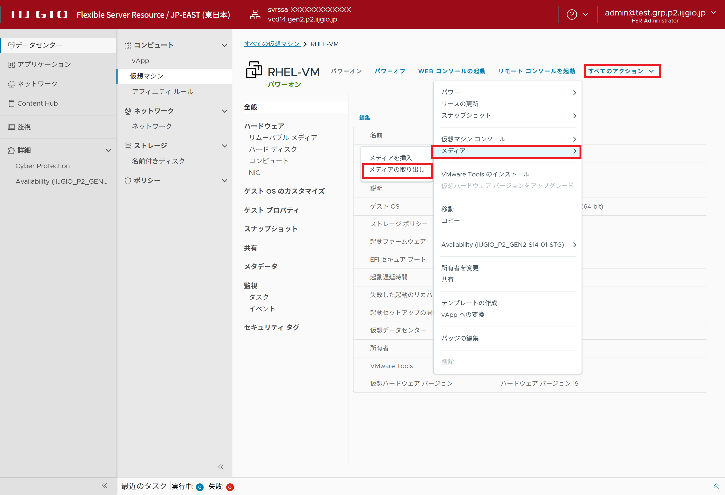 RHUI設定用のISOイメージファイルは、RHUI変更後、速やかにOSからアンマウントし、その後、「フレキシブルサーバリソースコントロールパネル」から「メディアの取り出し」を行ってください。また、ISOファイルの更新などの理由により、弊社側で強制的に「メディアの取り出し」を実施する場合があります。