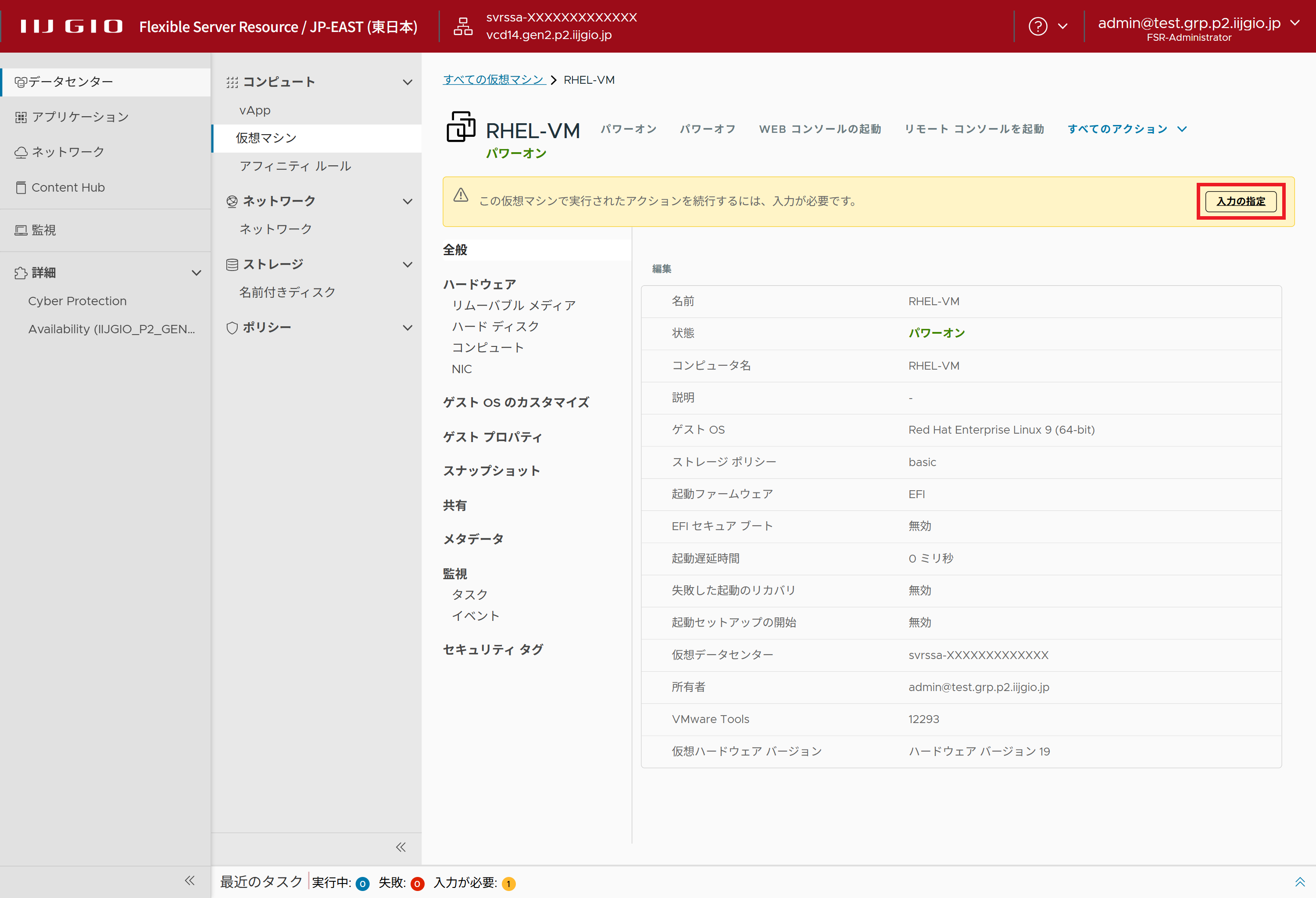 1.仮想マシンからのメディアの取り出しに失敗すると、以下のような入力を待機する画面が表示される場合があります。このような場合は「入力の指定」をクリックします。