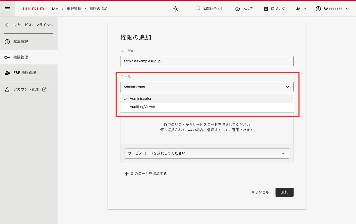 | AuditLogViewer | 監査担当者に相当するロールです。ロギングの「ログ表示画面」より、対応サービスの監査ログの参照が可能です。本ロールは全サービスコードに適用されるため、特定のご契約(サービスコード)を選択することはできません |