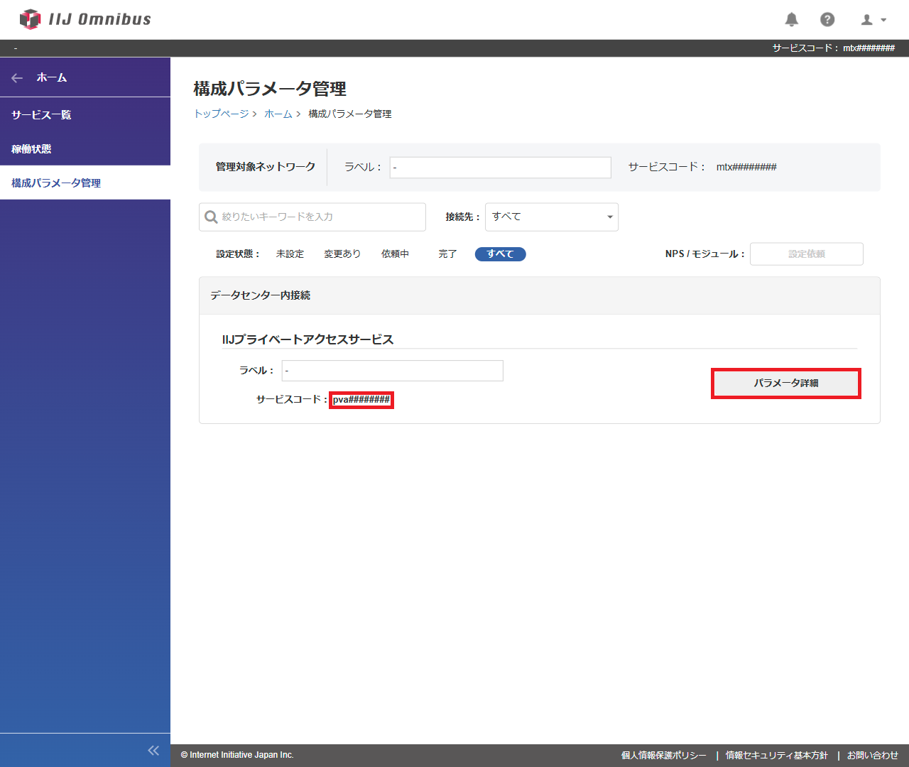 サービスコード(pva########)の「構成パラメータ」画面が表示されます。