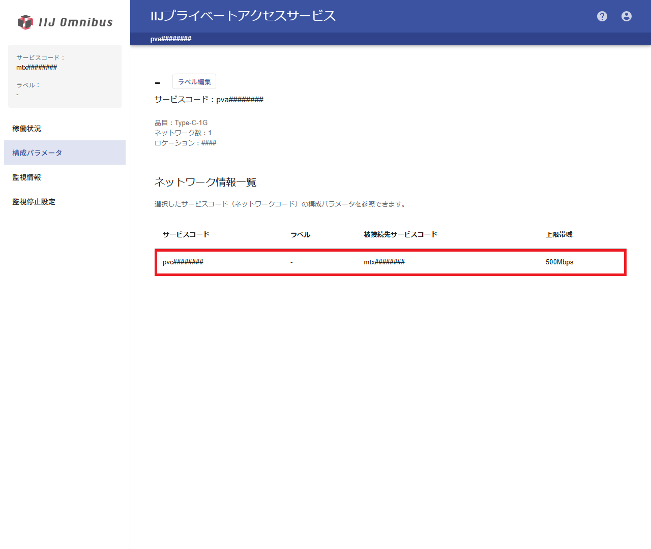 | 被接続先サービスコード | 本サービスと接続するPBBのサービスコード(mtx########)が表示されます | |