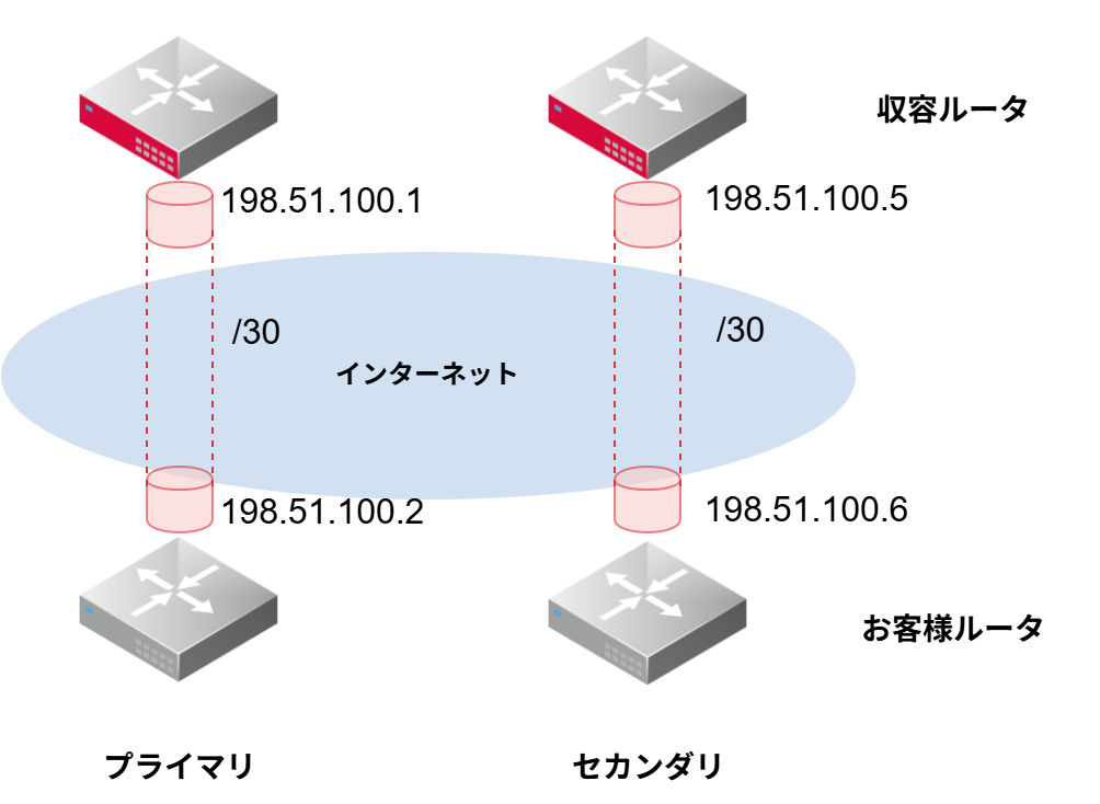 収容ルータとお客様ルータの境界セグメントを198.51.100.0/29として、下記に例を示します。